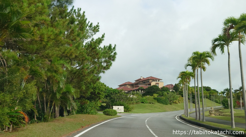 ヤシの木が並ぶ道路の左側に、リッツカールトン沖縄の建物がみえてきます