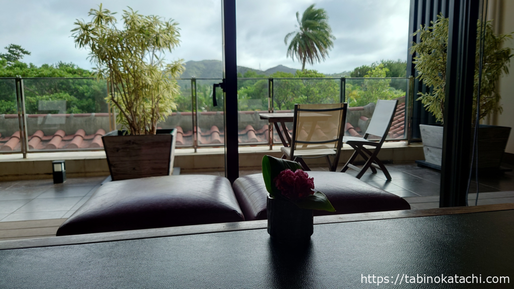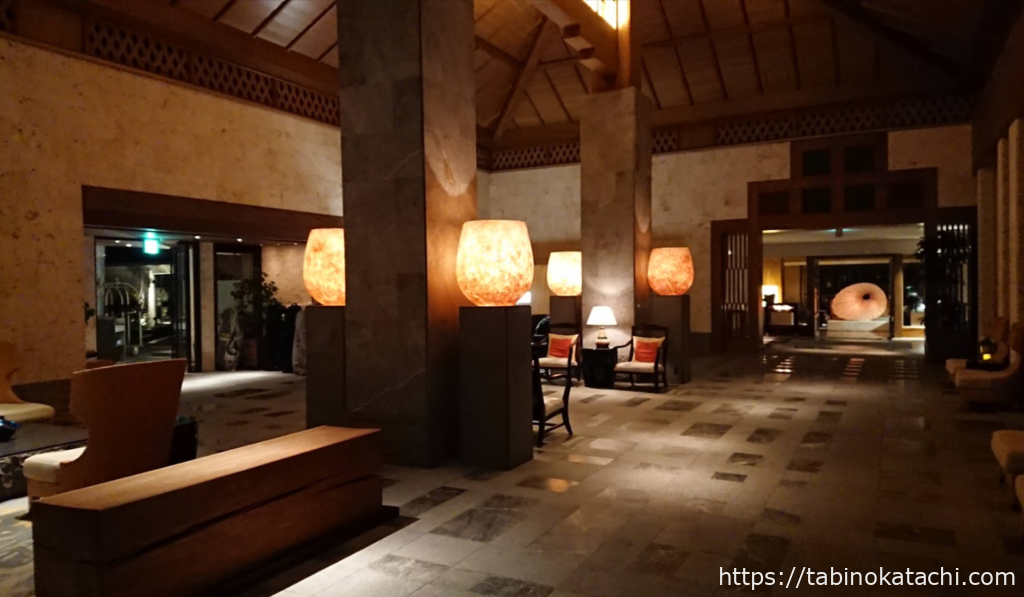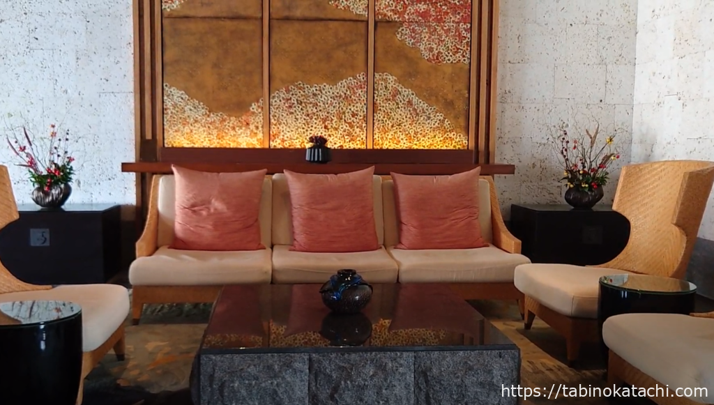ホテルのメイン棟。沖縄赤瓦が美しい建物です。ロビーに入ると、アロマがたいてあるようで、いい香りです。エントランスからいきなり、リゾートモードになりますね。天井も高く、インテリアも素敵です。本来はこちらでチェックインなのですが、今回は、クラブラウンジ付きのプランだったので、グラブラウンジにご案内いただき、そこでチェックイン手続きを行いました。