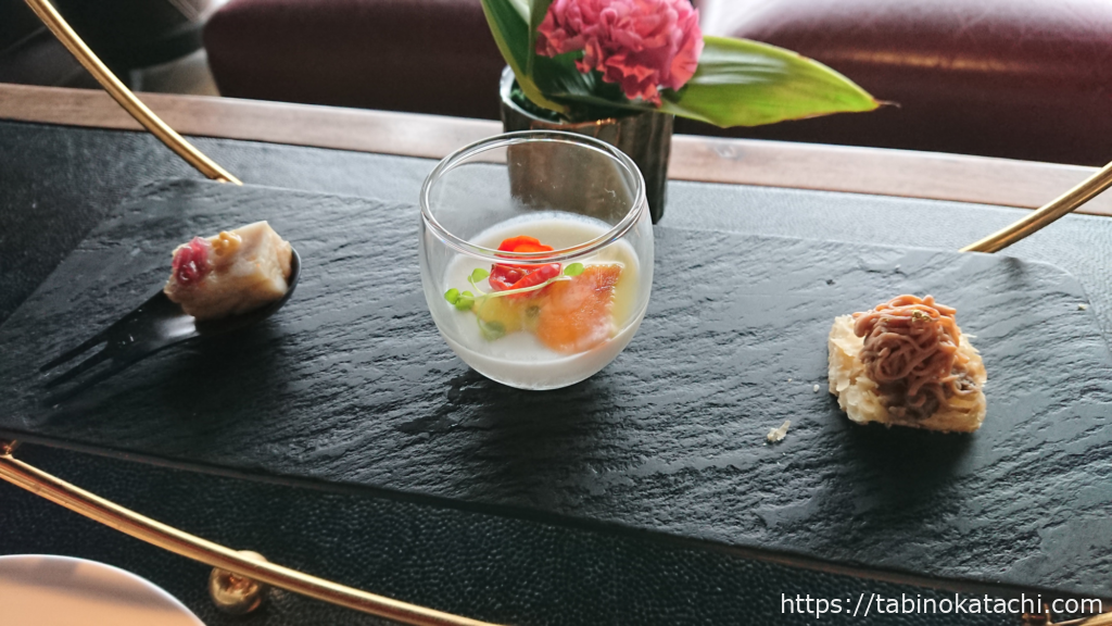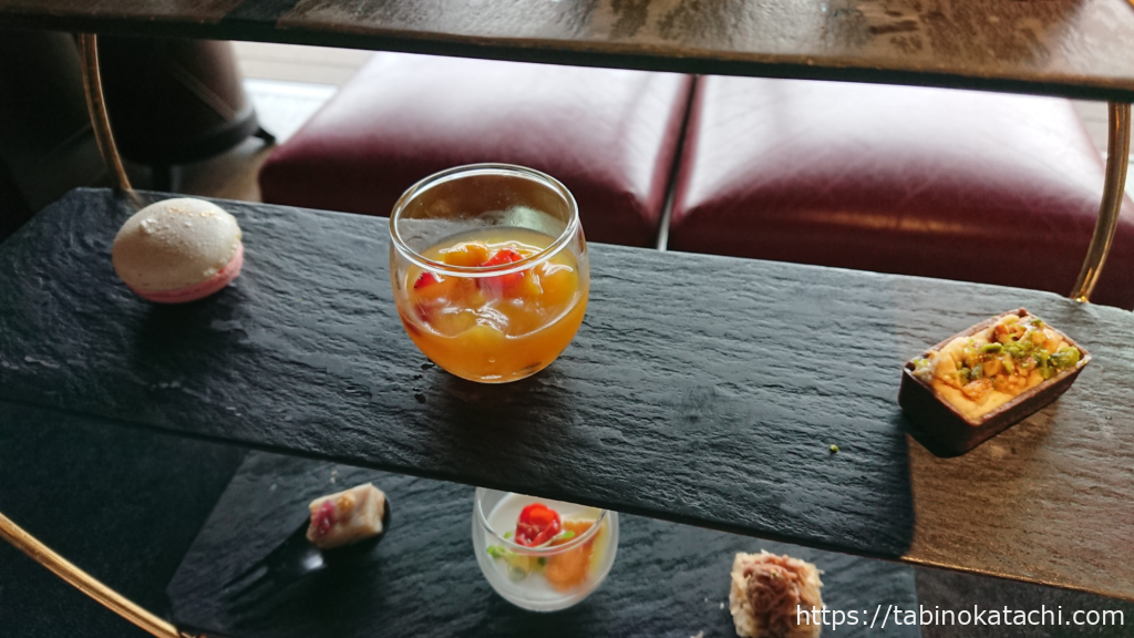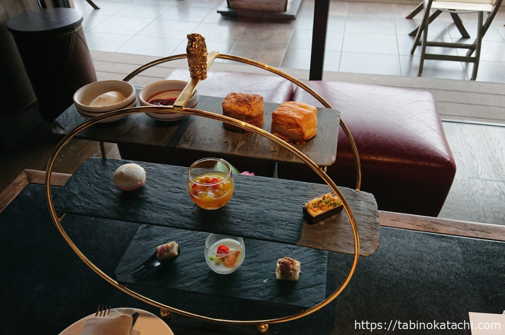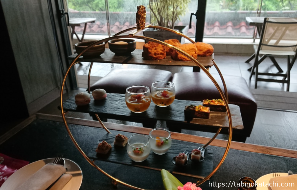 沖縄の食材がふんだん使用されたアフタヌーンティ。1つ1つが丁寧に作られていて、美味しかったです。お酒を飲まれる方にもあいそうなものも、ありました。ロビーラウンジでもアフタヌーンティがいただけて、少し品数が増えるようです。とはいえ、同じメニューも多く、ロビーラウンジだとおひとり4500円かかるので、クラブラウンジでアルコールと一緒にいただけるのは、かなり、お得だとおもいます。