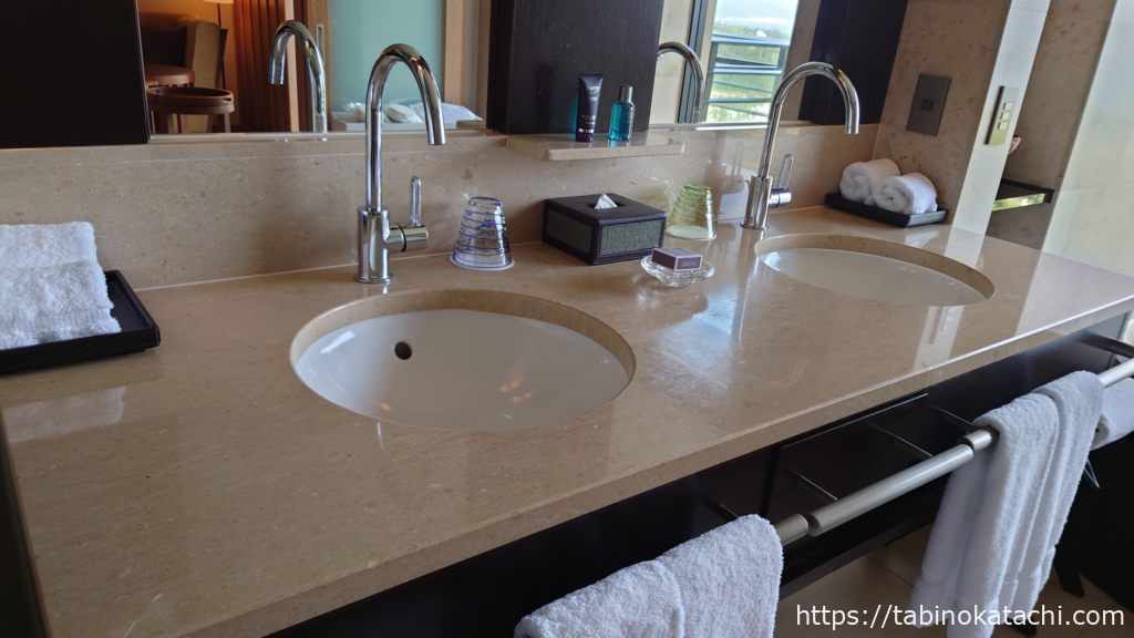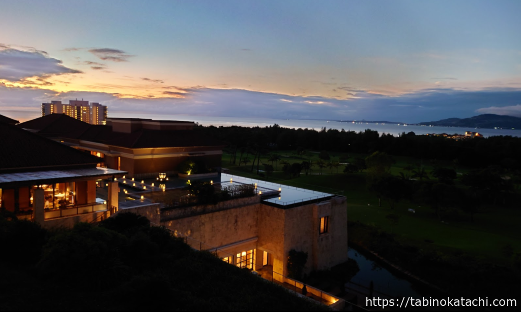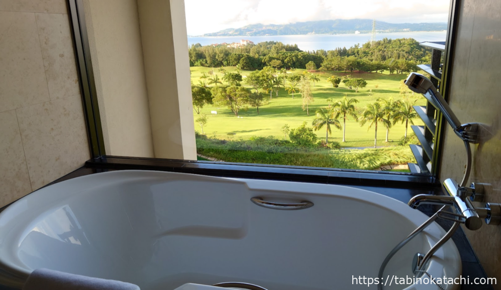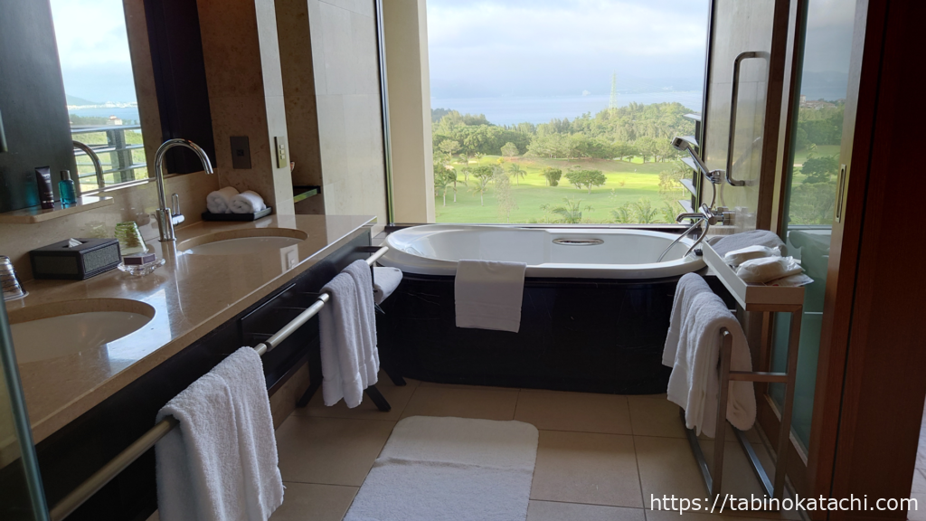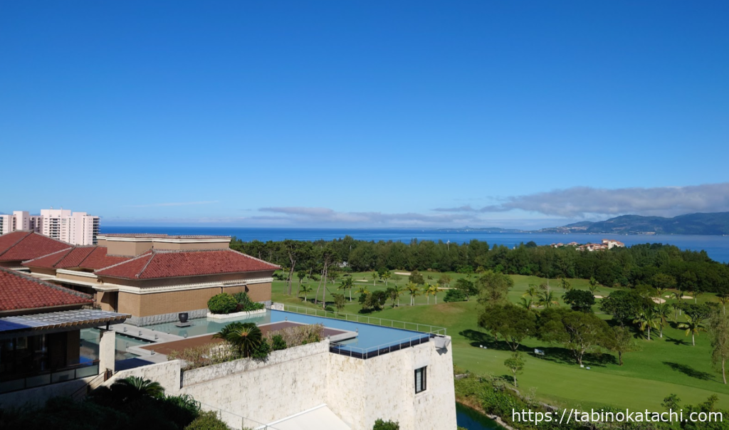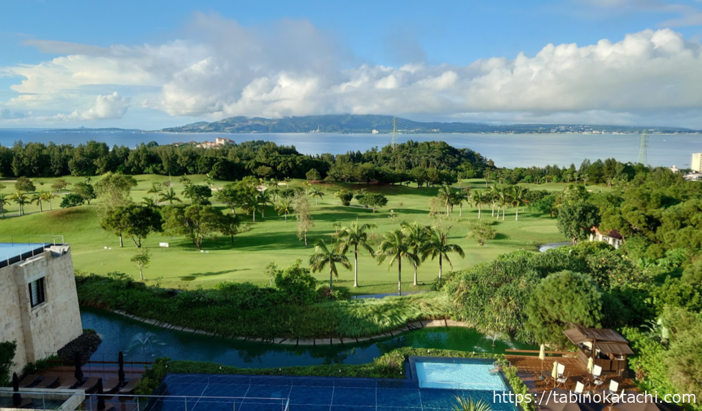 ベイデラックスルームは、デラックスルームと同様の45㎡、二人でつかうには十分な広さです。プールサイド側の高層階のお部屋をアサインされたので、プール、ゴルフ場、名護湾と、リゾート感満載の眺望でした。