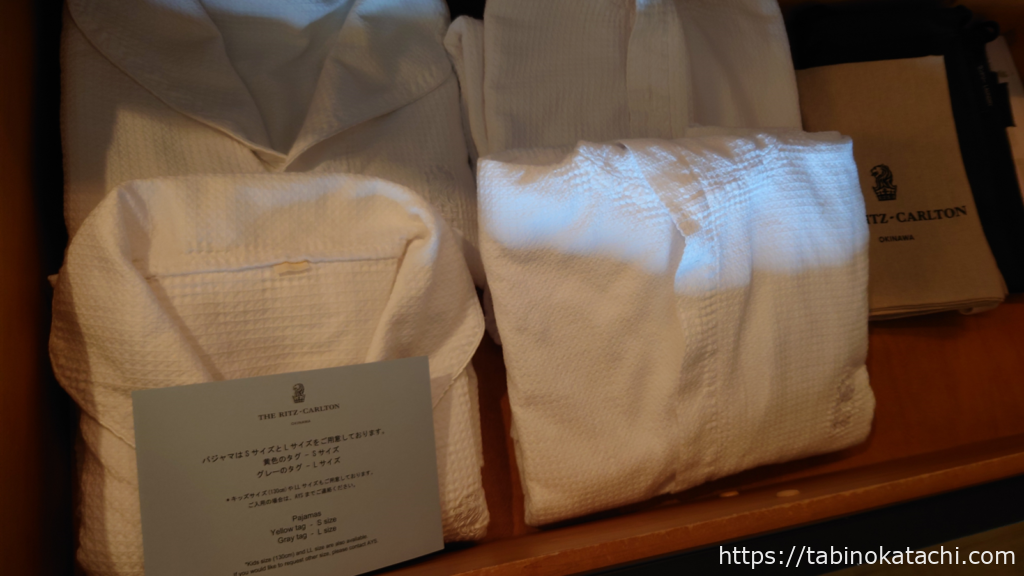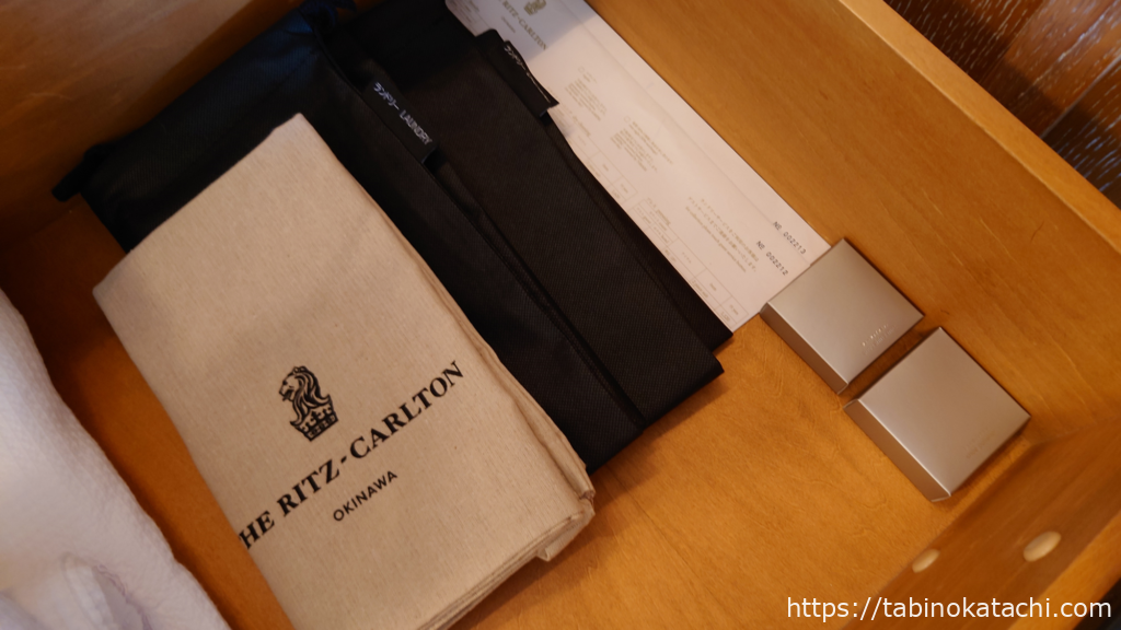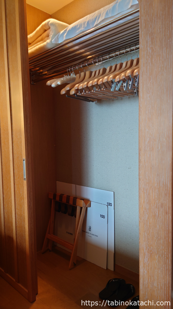 クローゼットも広く、ハンガーの数も申し分ないです。お土産や荷物などをおくるための段ボールも準備がされていました。また、リッツカールトンロゴの黒いビーチサンダルも恰好よかったです。