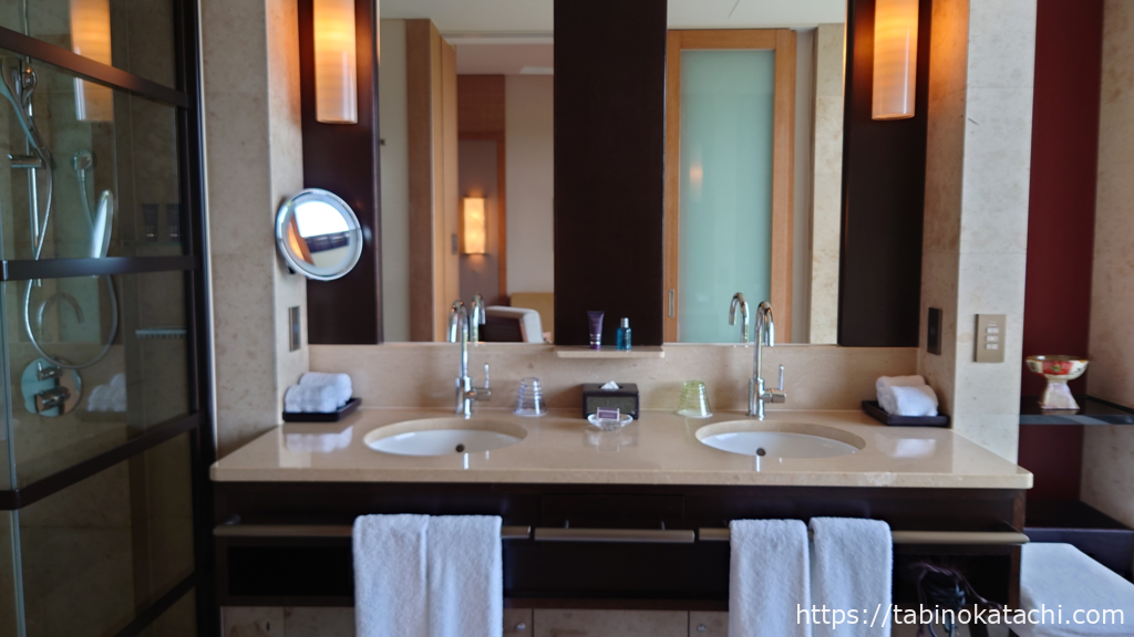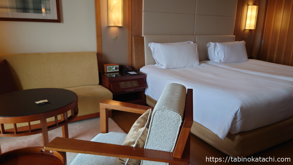 今回アサインいただいたお部屋は530号室。ベッドサイドに、ソファとテーブル、チボリオーディオなどがそろっています。2012年の開業から10年ほどたっているので、ソファはなどはそろそろ、新調されてもいいかなぁともおもいますが、それでも、素敵な客室です。