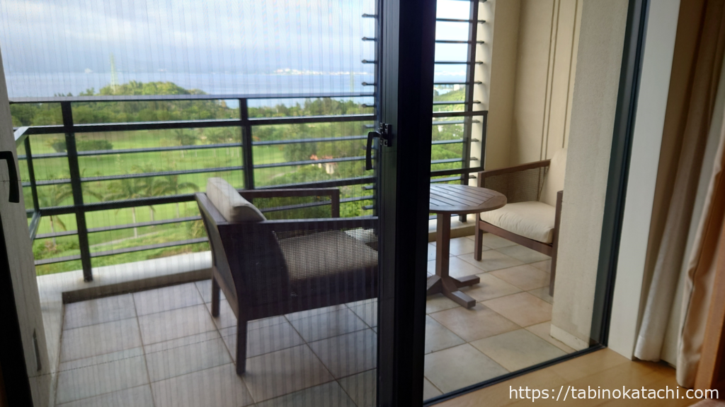 ベッドサイドからテラスに出られるようになっていて、網戸を利用して、窓を開放しておくことも可能でした。天気の良い日は解放していても、気持ちいいと思います。また、高台にあるホテルなので、お天気がよいと、名護湾や本部半島まで見通せます。ゴルフ場の緑とのコントラストがとても美しかったです。