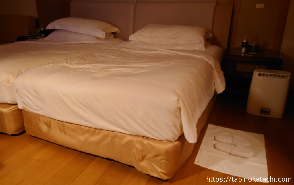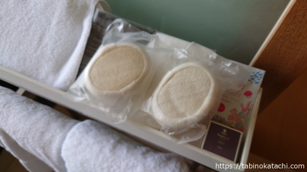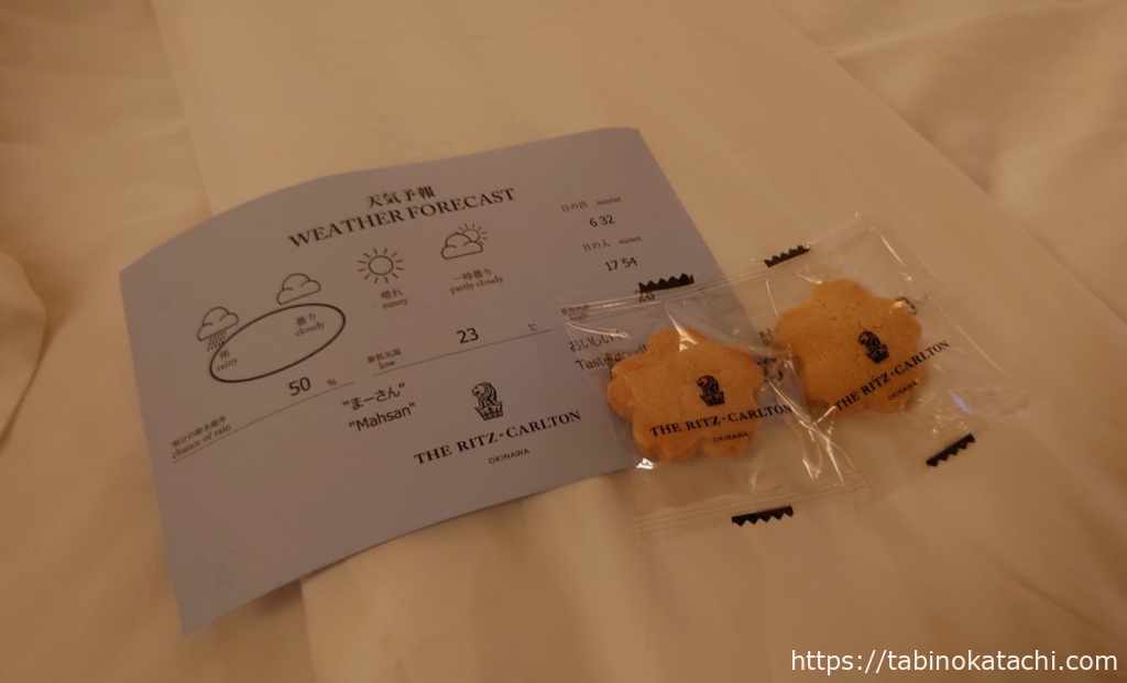 スリッパを出してあり、ベッドサイドにはお水とグラスを用意いただいています。もちろん、使用したタオルなども交換いただいていています。また、ベッドの上には、明日の天気とナイトスナックのちんすこうが!今回、連泊したのですが、2日目はチョコレート味のちんすこうでした。ホテルのショップでも購入が可能です。