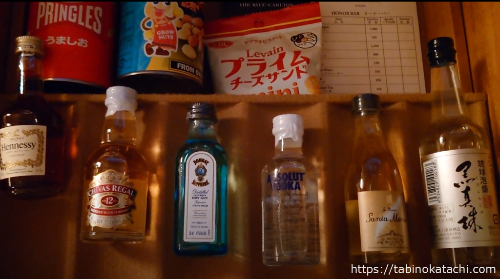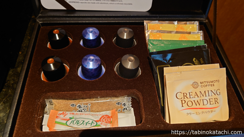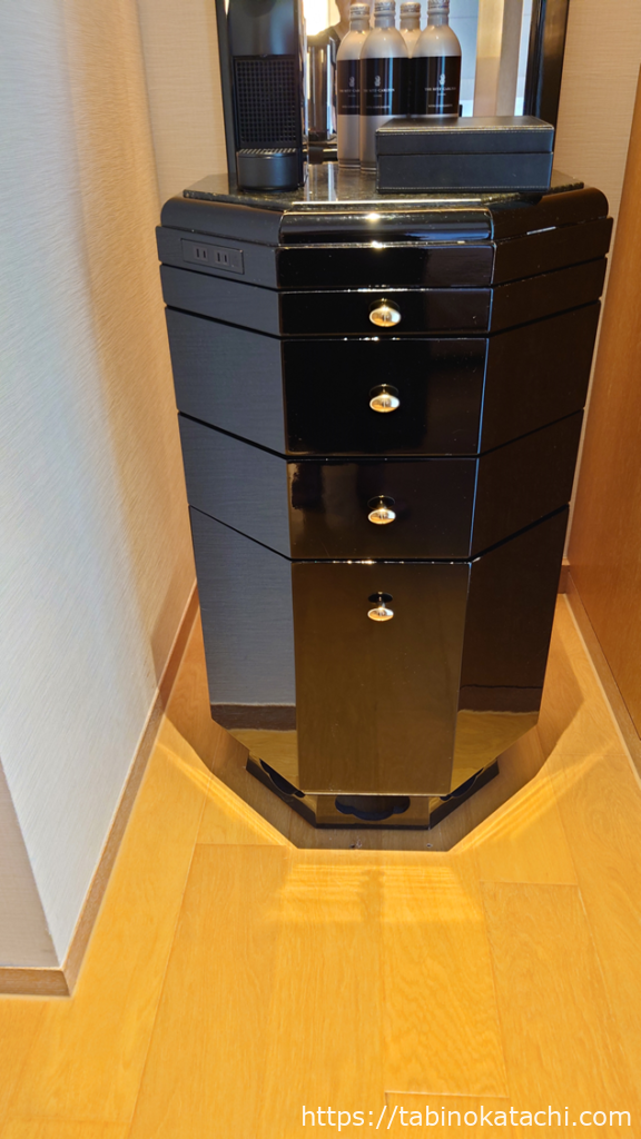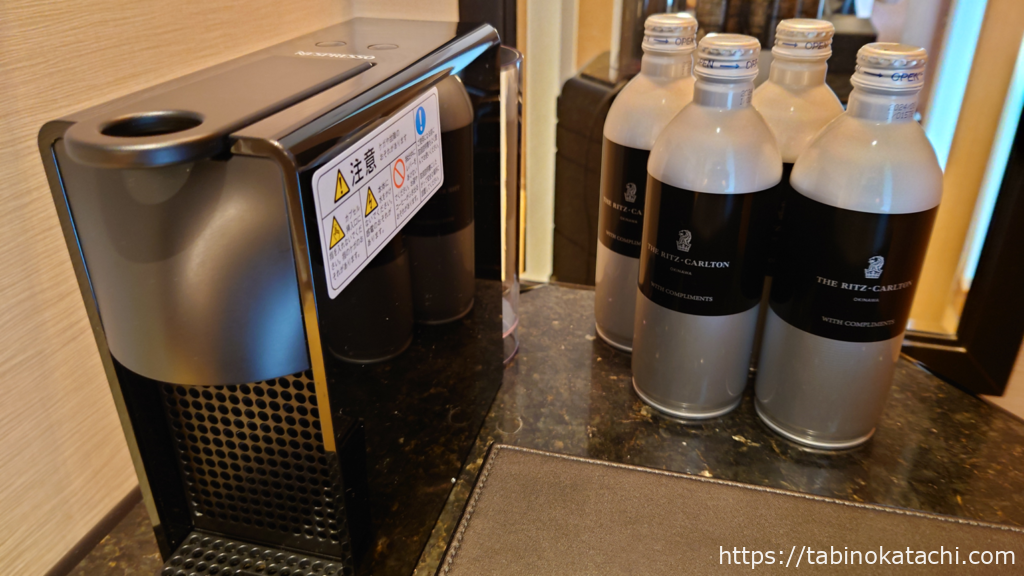 ミニバーは、お部屋の入口にお水や、ネスプレッソ、グラスなどが一通りそろっていて、こちらは、無料でいただけます。