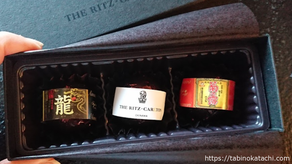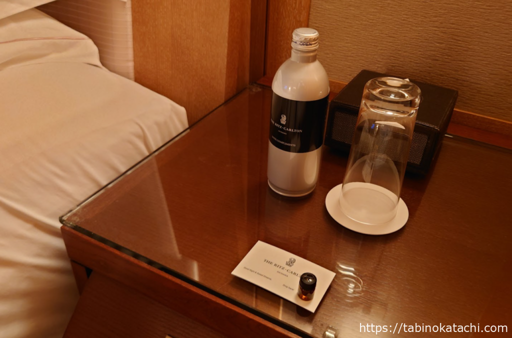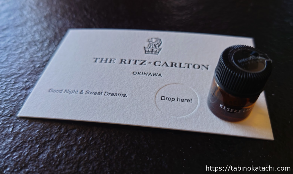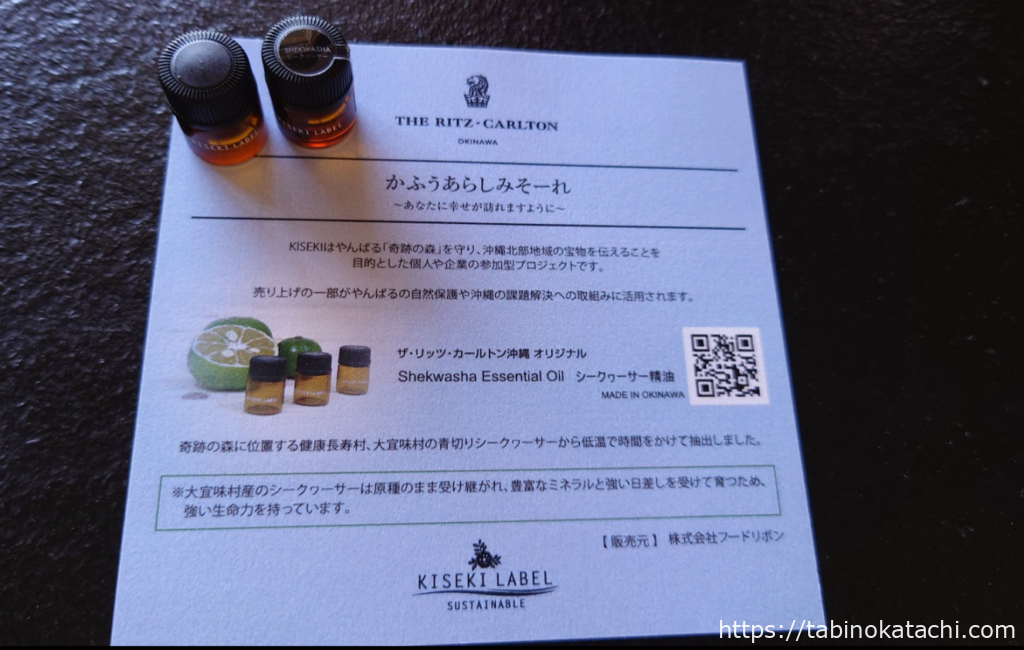 お水と一緒においてあったのは、リッツカールトン沖縄オリジナルのアロマオイルです!シークワーサの爽やかな香りで、夜というよりは朝向け?という気もしますが、こういったサービスは嬉しいですね。