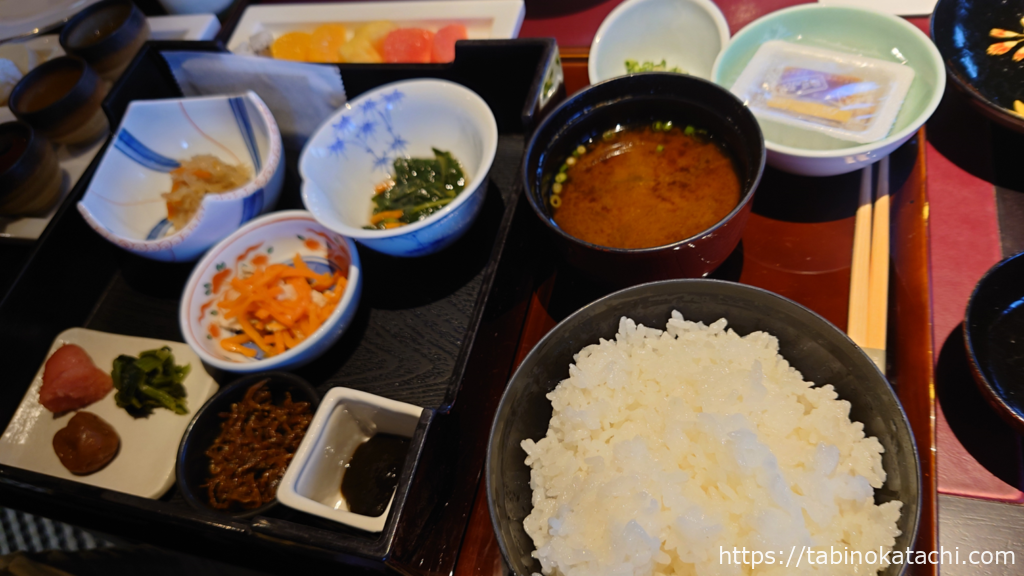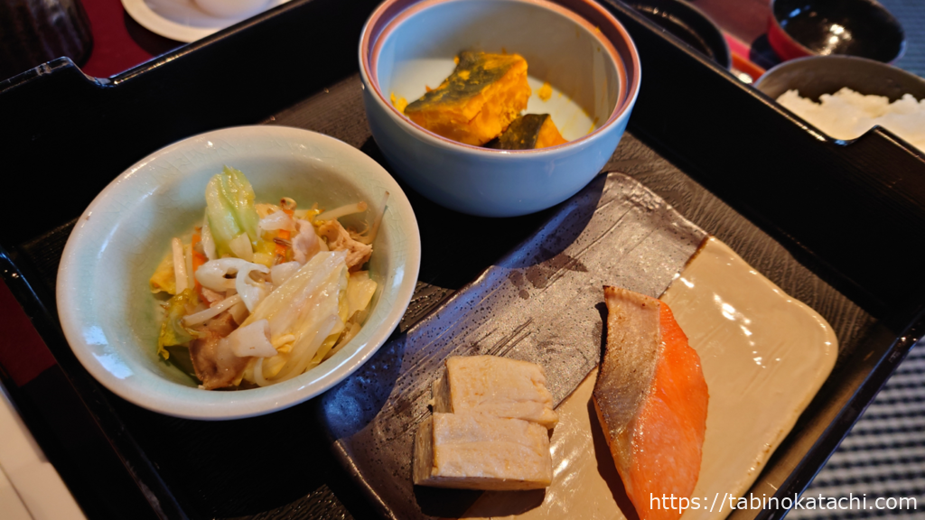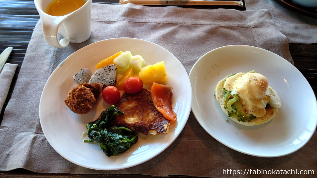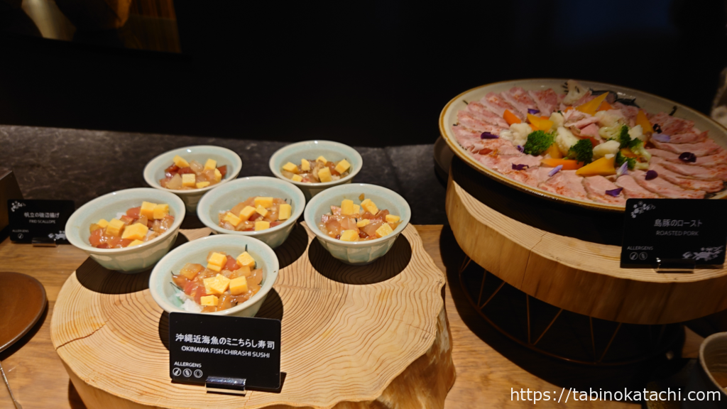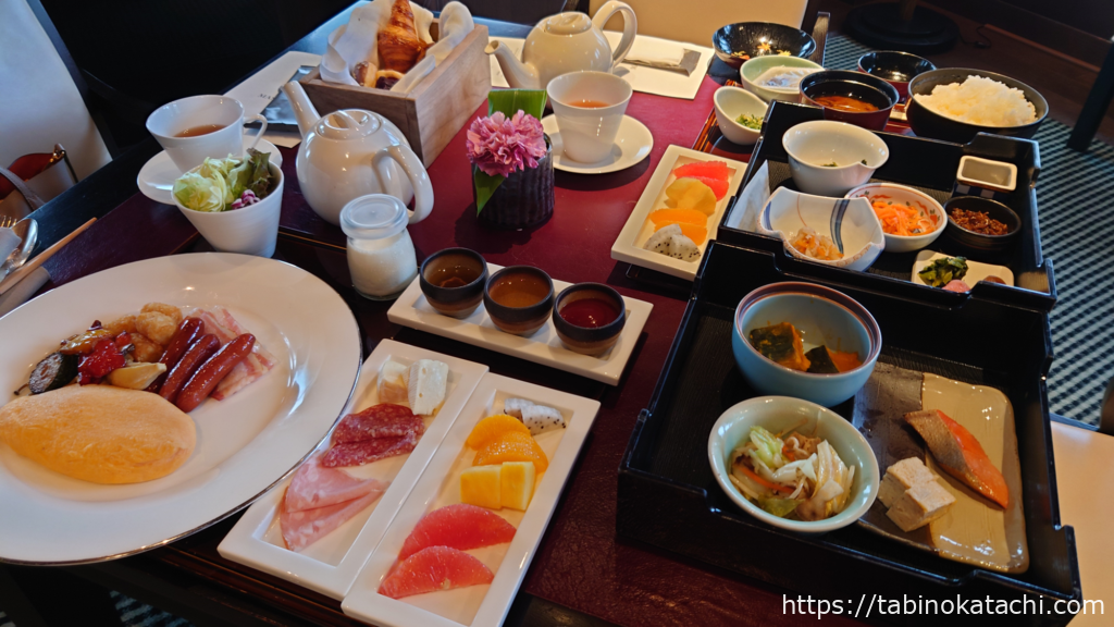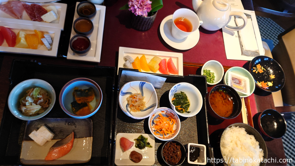 和食は、ごはん、お味噌汁、焼き魚に香の物、小鉢にお惣菜系が複数種類、納豆、フルーツです。沖縄らしさでいえば、小鉢にチャンプルーがあったぐらいでしょうか。どちらも美味しかったのですが、もうすこし沖縄ぽさ?的なものがあっても、良かったかもしれませんね。