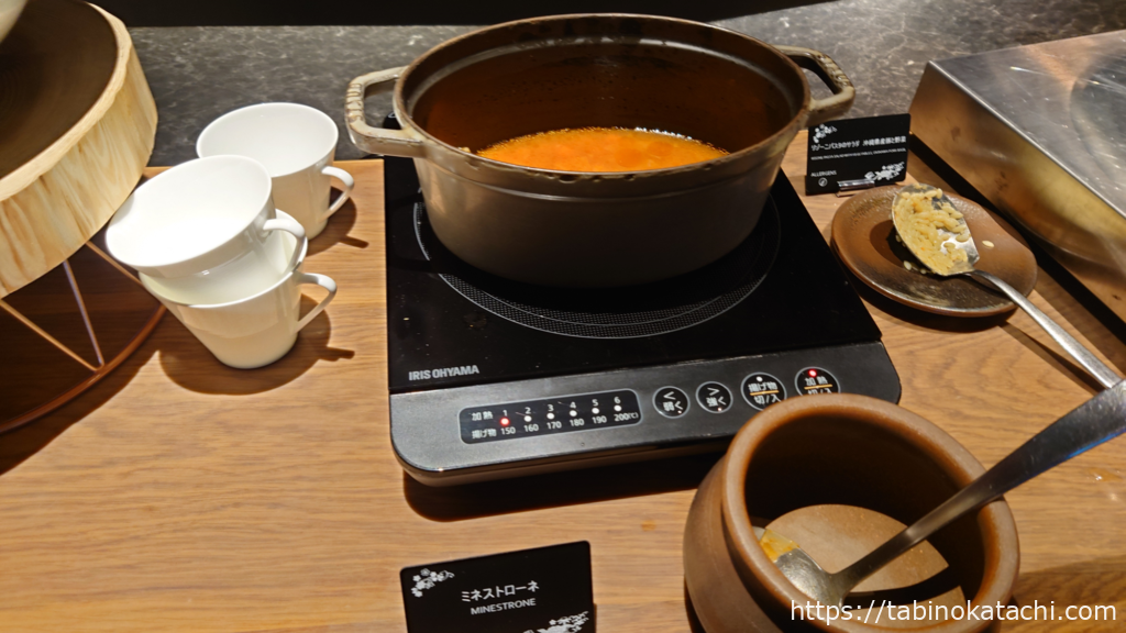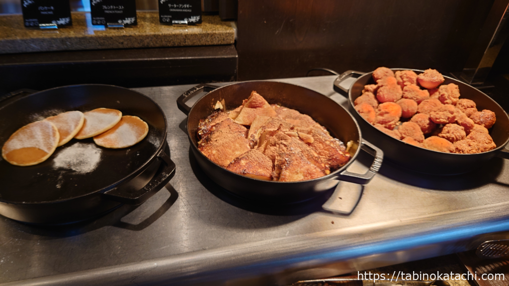 ほかに、パンケーキやサーターアンダギー、シリアル、ヨーグルト、各種ブレッド、ドリンクなどが並んでいて圧巻です。ストウブのお鍋でサーブされているのも素敵でした。