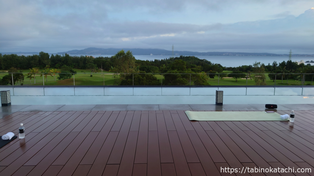 開催された日のハタヨガ。夜、雨が降っていたので、まだ床が濡れていました。運動できる恰好に着替えて、3階のテラスにいくと、ヨガマット、お水、タオルが用意されていました。海と緑をみながら体を動かすのは気持ちいいです。朝の少しひんやりとした空気のなか、インストラクターの方の声にあわせて、ゆっくりと体を動かします。担当してくださったのは、アルゼンチン出身の男性の方で、日本語と英語がちゃんぽんで教えて頂きました。