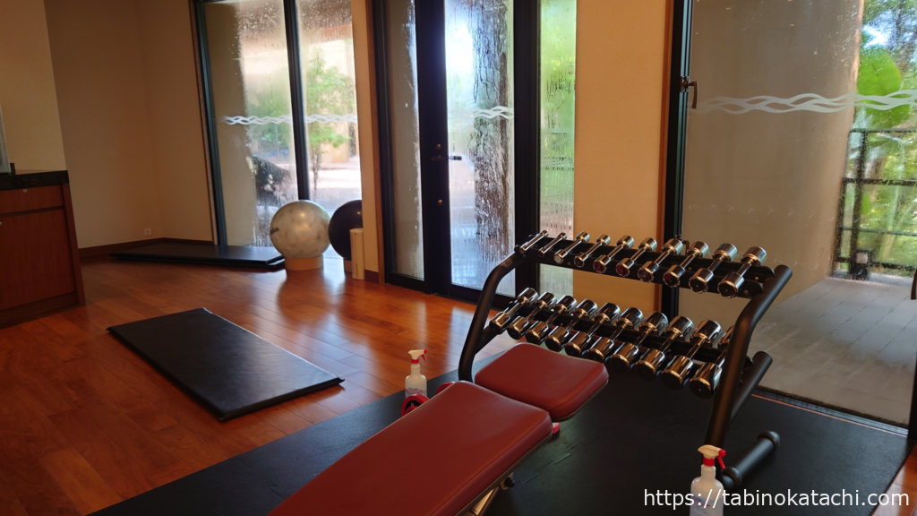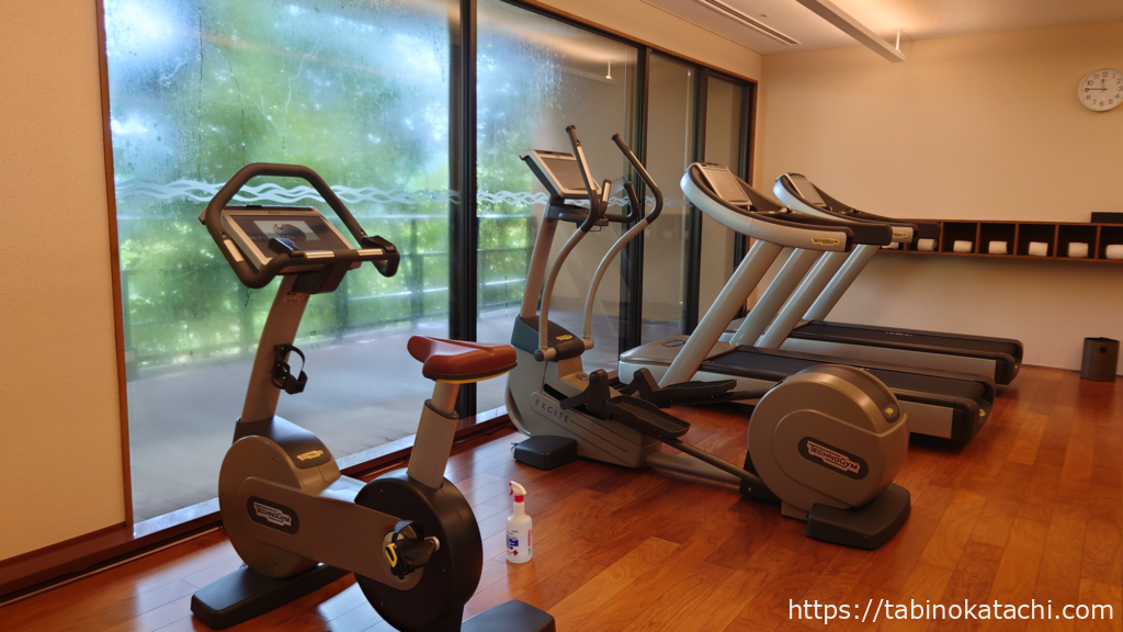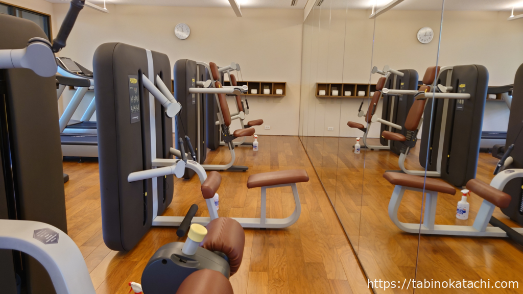 スパ棟にはいり、階段をおりていくとジムがあります。ランニングマシーン、バイク、ダンベル、トレーニングマシーンなどがそろっています。