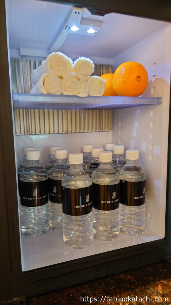冷蔵庫の中には、冷たいおしぼり、お水、オレンジ!などもそろっていました。