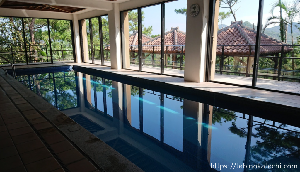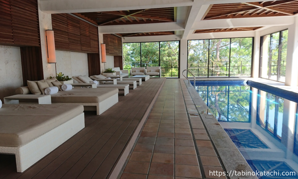 ジムと同じ階に、屋内プールがあります。屋外プールがまだ利用できる時期だったので、こちらは利用者が少ない感じでしたが、充実しています。全面が窓で、外にはジャクジーやデイベットもあり、1日こちらでのんびりするもの、ありですね。今回は、プールは利用しなかったのですが、こちらで読書とかもよさそう。