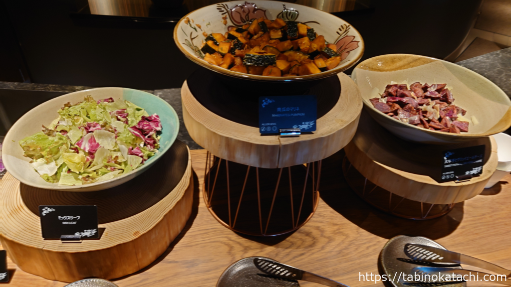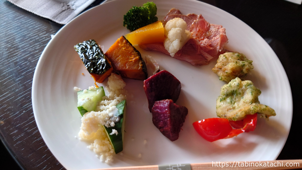 軽食といっても、かなり種類がありました。お肉系、モズク酢、ちらし寿司、グリル野菜、スープやサラダなど!ホテルに滞在すると、ついつい毎食食べ過ぎてしまいますが、お野菜のメニューが豊富なのがいいですね。