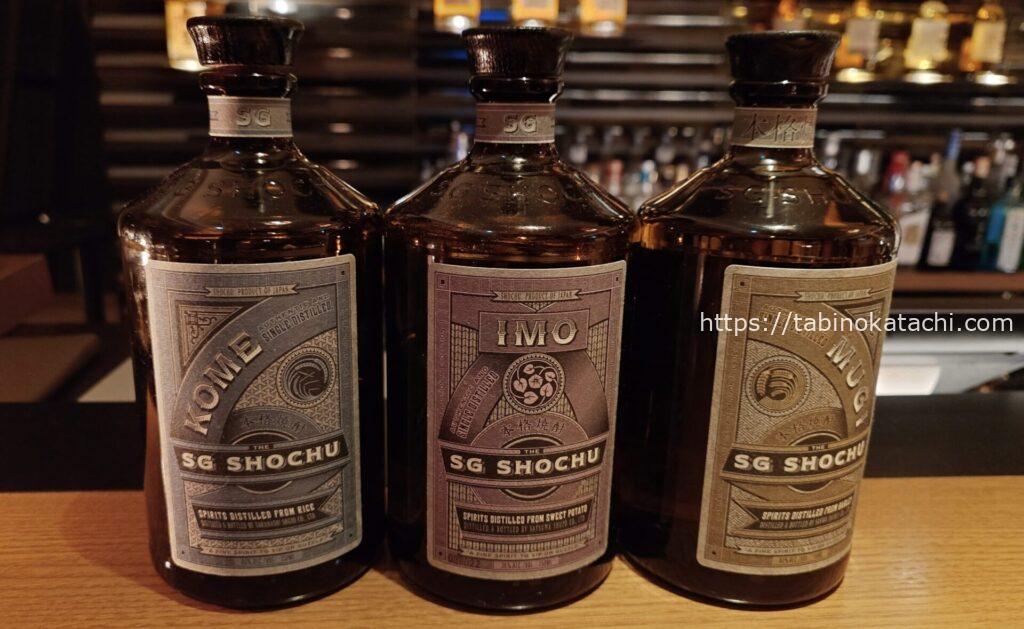 薩摩酒造産の「カクテル利用」を主目的として開発された本格芋焼酎(真ん中)。そのほかに、米と麦もあり、「並べると繋がるデザインなんですよ」と、バーテンダーさんに教えていただきました。