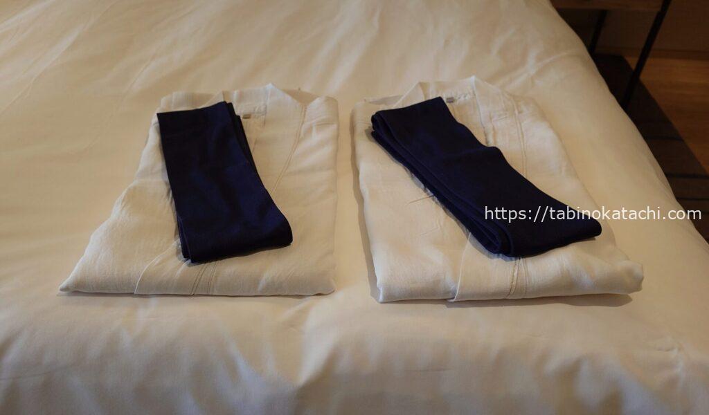 お部屋においてある浴衣。お風呂に着ていくことが可能ですが、リバーサイドガーデンビューの棟に宿泊している場合、ロビーラウンジの前をとおっていくことになるので、日中は若干恥ずかしい?! 中禅寺湖ビューのお部屋の場合だと、エレベーターで降りた先に、そのまま温泉・スパ棟にいける通路なので、この辺りも、お部屋のお値段の差ですかね。