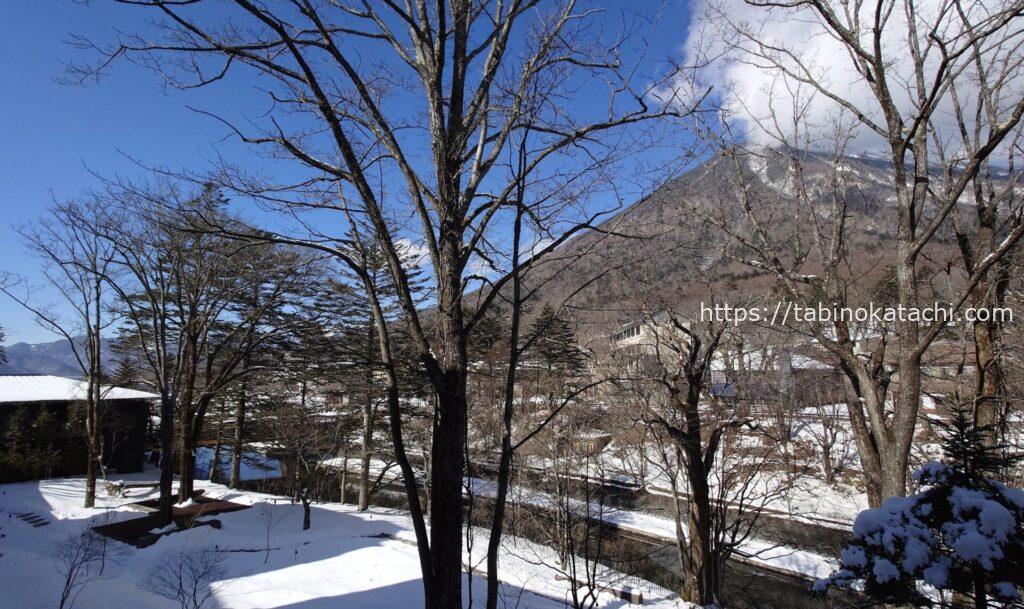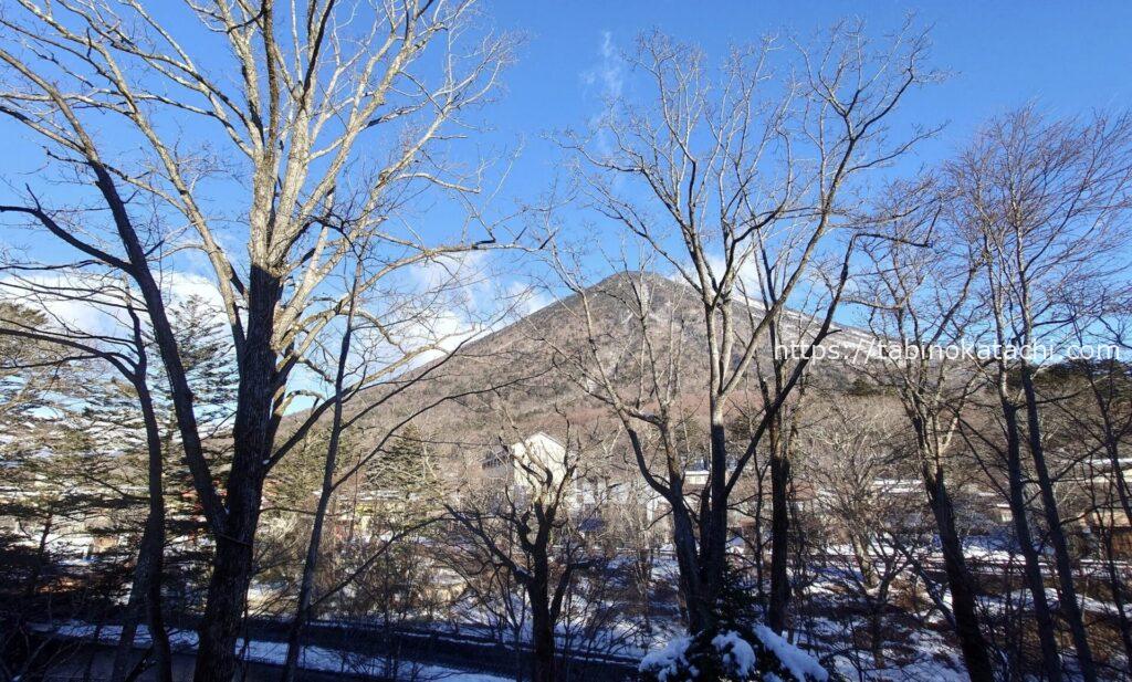 お部屋からの風景。新緑の頃は、木々に隠れて見えなかったのですが、冬は男体山が、はっきりみえます。滞在中は本当にお天気に恵まれて、何十枚、お山の写真をとったことか😛