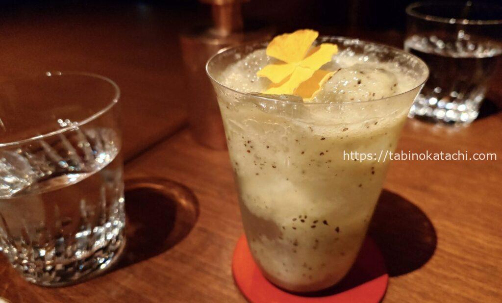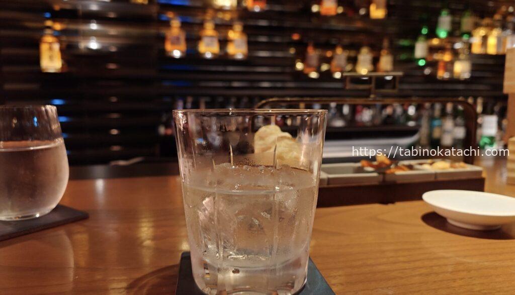 薩摩酒造産の「カクテル利用」を主目的として開発された本格芋焼酎(真ん中)。そのほかに、米と麦もあり、「並べると繋がるデザインなんですよ」と、バーテンダーさんに教えていただきました。