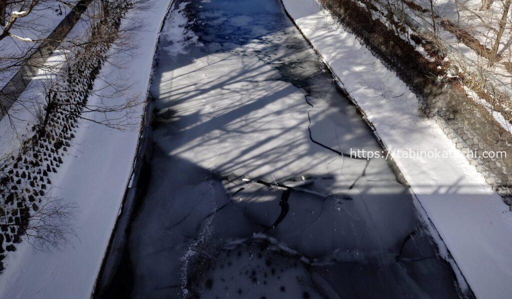 こちらは、上からみたところ。 冬でも凍らずに滝がながれています。