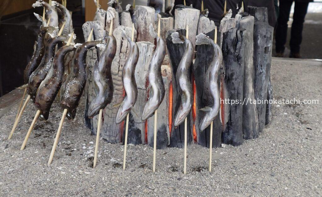 エレベータ乗り場のそばにあるお茶屋さんでは、川魚の塩焼が売られていました。美味しそう!朝ごはんでお腹いっぱいだったので食べれませんでしたが、香ばしい香りが周囲にひろがっていました。