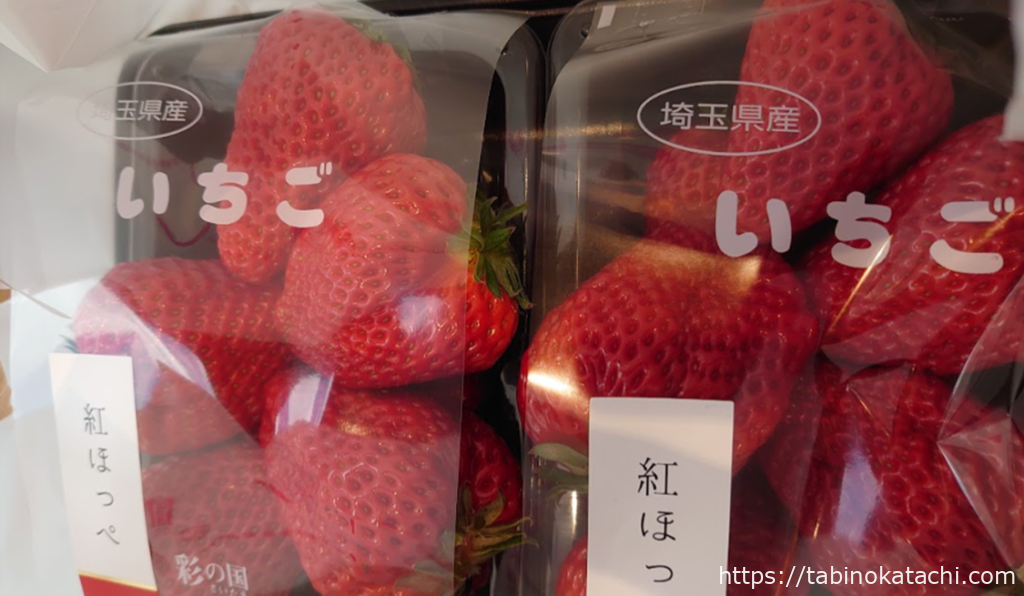 今回購入したのはこの3つ。生の苺4パック。こちらは自宅へのお持ち帰り用。あとは、オヤツで食べる苺大福と、苺のフルーツサンドです。