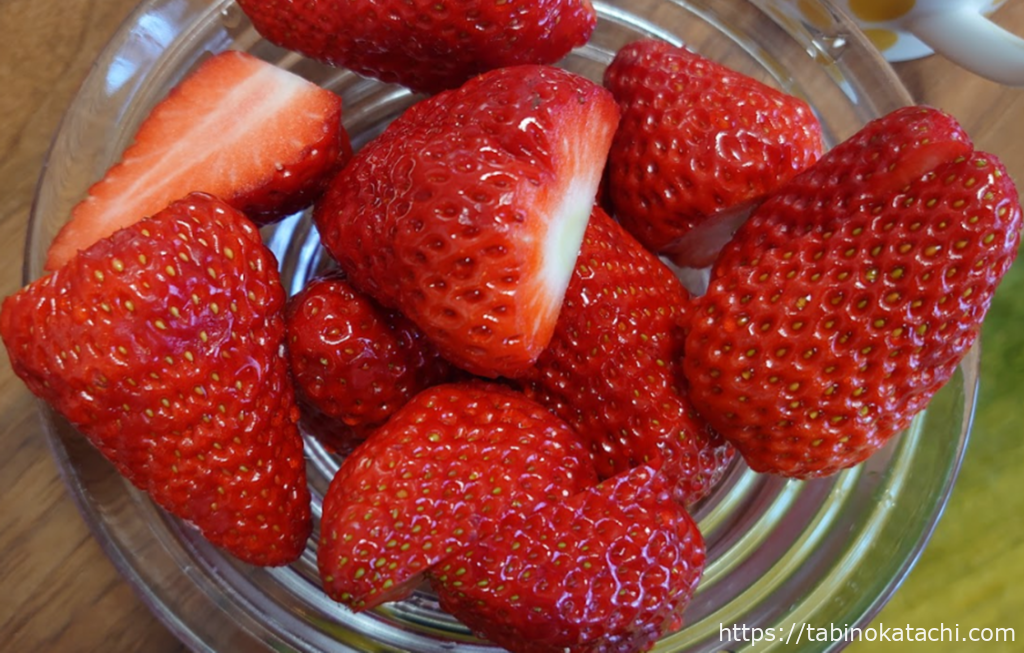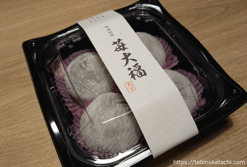 どちらも、お宿に着いてからいただきましたが、入っている苺が大きくて、甘く、あんこや生クリームにとてもマッチしていました。使われいる紅ほっぺは、適度な酸味と硬さで、スイーツと相性がいいそうです。苺大福は、1家族XX個まで・・・という但し書きがあったので、人気なんですね。確かに、一度たべたら、また食べたい!