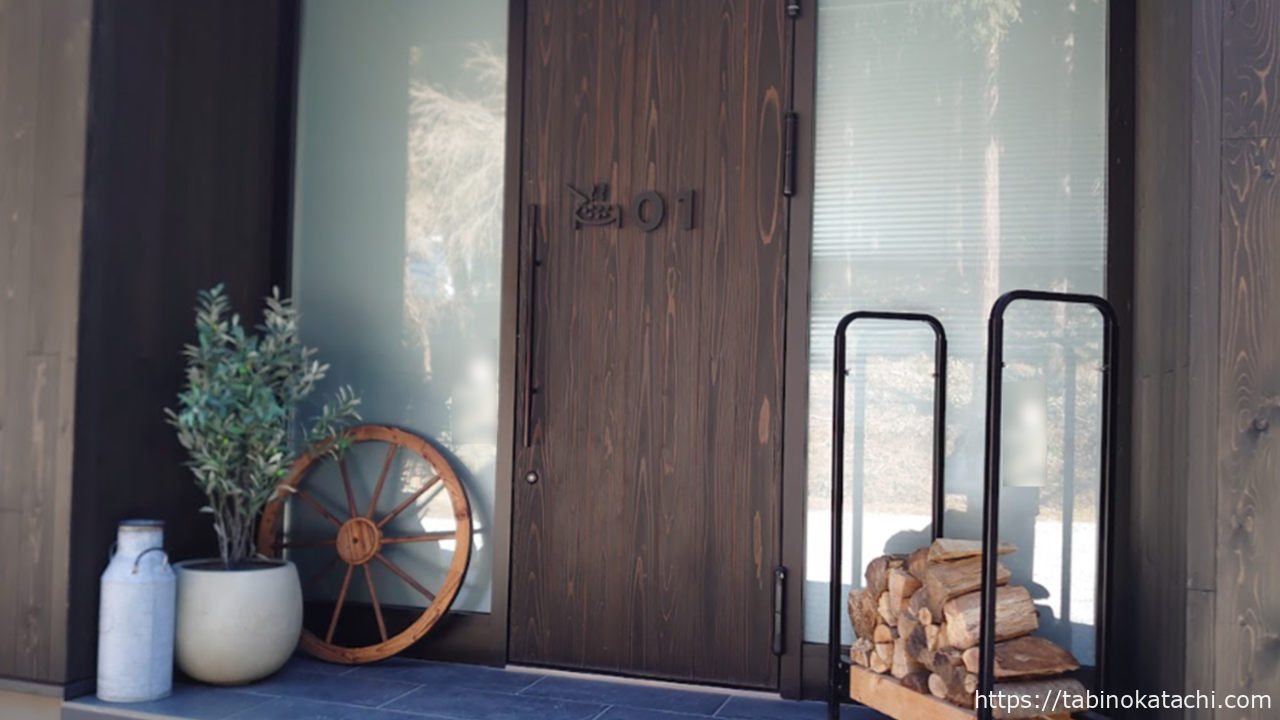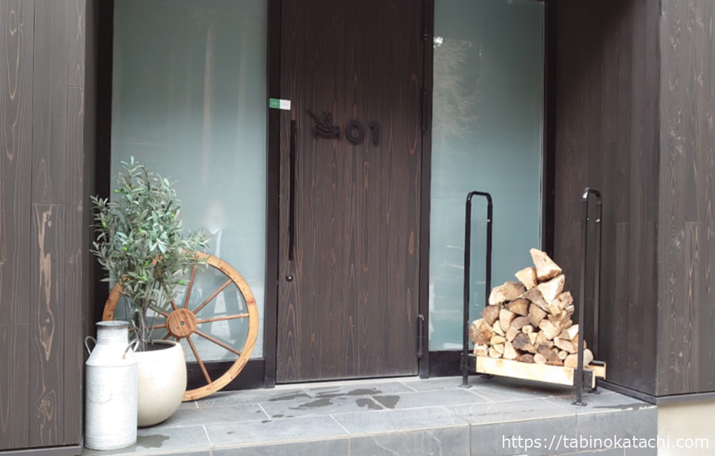 お部屋は、No.01 。お家の前には、お部屋の暖炉でつかえる薪がおいてあります。また、ドアには、緑と白のシールで、清掃後にだれもはいってませんよの印。お部屋の番号のよこには、サウナスートンにロウリュウしているロゴがあって、テンションがあがります!