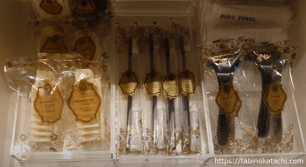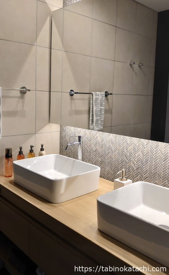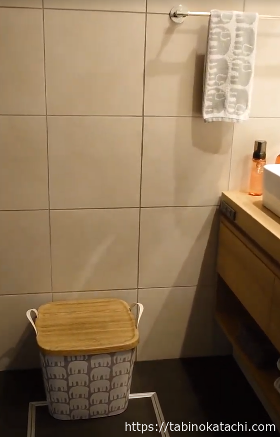バスルームは、ベットルームの先にあります。グレーとクリーム色を基調とした落ち着いた色合いで、ここにもフィンレイソンのデザインが沢山使われています。ダブルシンクで、使い勝手もよく、洗顔料やお化粧水、乳液などの基礎化粧品(POLA)や歯ブラシやブラシ、髭剃りなどのアメニティも一通りそろっています。