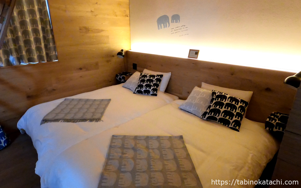 U字の反対側、こちらがベットルーム。シングルベットが2つならんでいて、電光色のあかりがあたたかい印象です。ベッド側の壁にもエレファンティが!なんとエレファンティのデザイナー ライナ・コスケラの直筆メッセージだそうです。