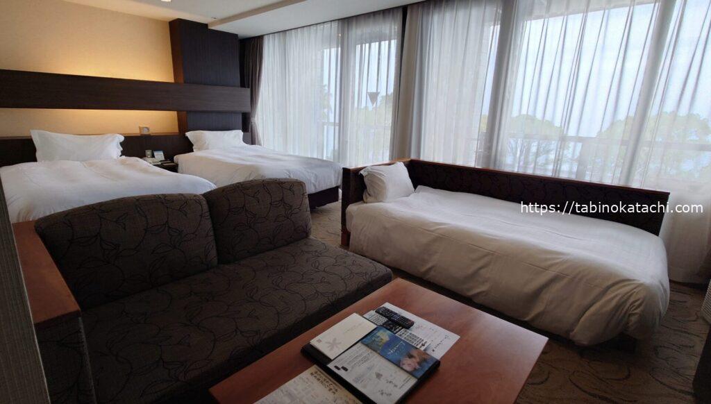 紀淡海峡を望むお部屋。エキストラベッドがはいっているので、少し手狭にみえますが、37平米のお部屋です。二人であれば、広々だとおもいます。