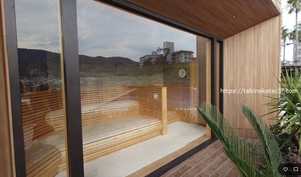 こちらは、ホテル島花にある、ハーバーズサウナ。2023年6月にオープンしたばかりで、とっても綺麗。海に面した場所にあり、水着で着用なので男女一緒にはいることができます。