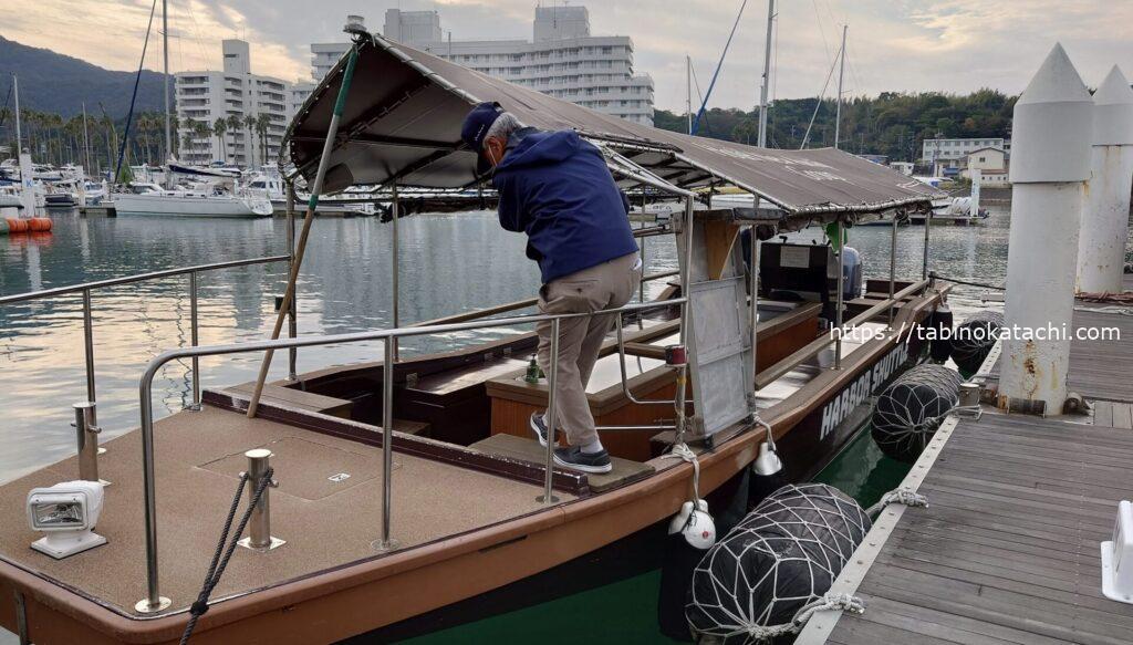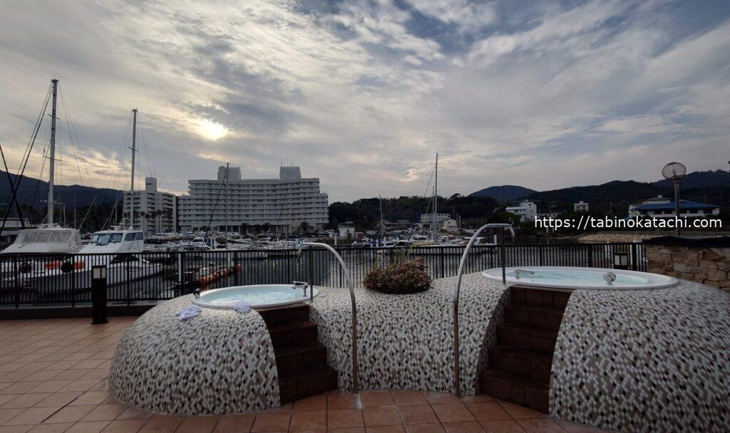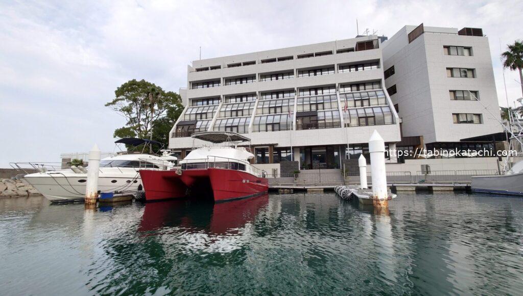 マリーナ前にたつ立地を活かして、専用のグラスボートで、対岸のニューアワジに渡り、「スパテラス水月」を無料で利用することができます。また、マリーナに停泊しているクルーザーに宿泊するプランもあり、ファミリー宿泊でも楽しめるお宿です。