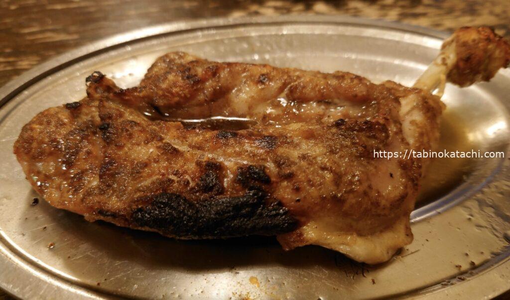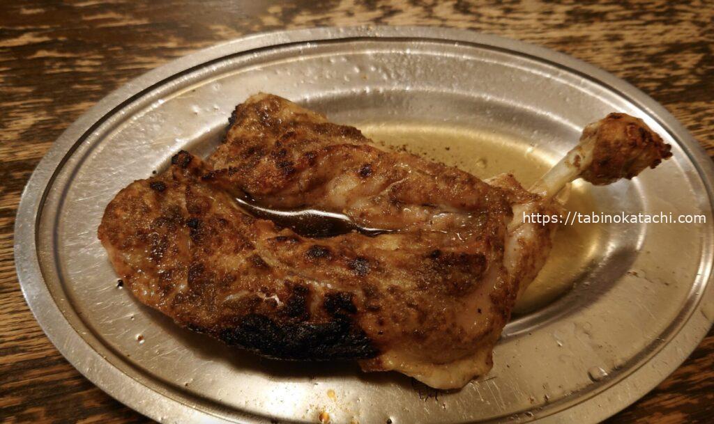 一鶴は、1952年(昭和27年)に創業され、70年以上続くお店です。スパイシーな香辛料で味付けされ、パリッと焼き上げられた鶏のもも肉を、手づかみで、丸ごと豪快にいただきます。肉汁がジューシーで、手がベトベトになるけれど、それもまたいい!