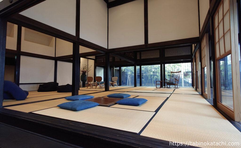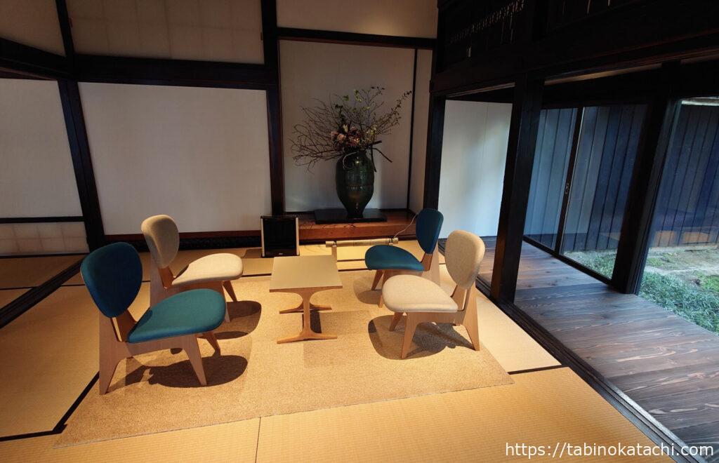 ラウンジは、和室の空間も広がっています。山形の天童木工さんのチェアやロッキングチェアなどもあり、ラウンジ横のドリンクバーはフリーフローとなっていますので、こちらでゆっくり、コーヒーやアルコールをいただくことが可能なつくり。