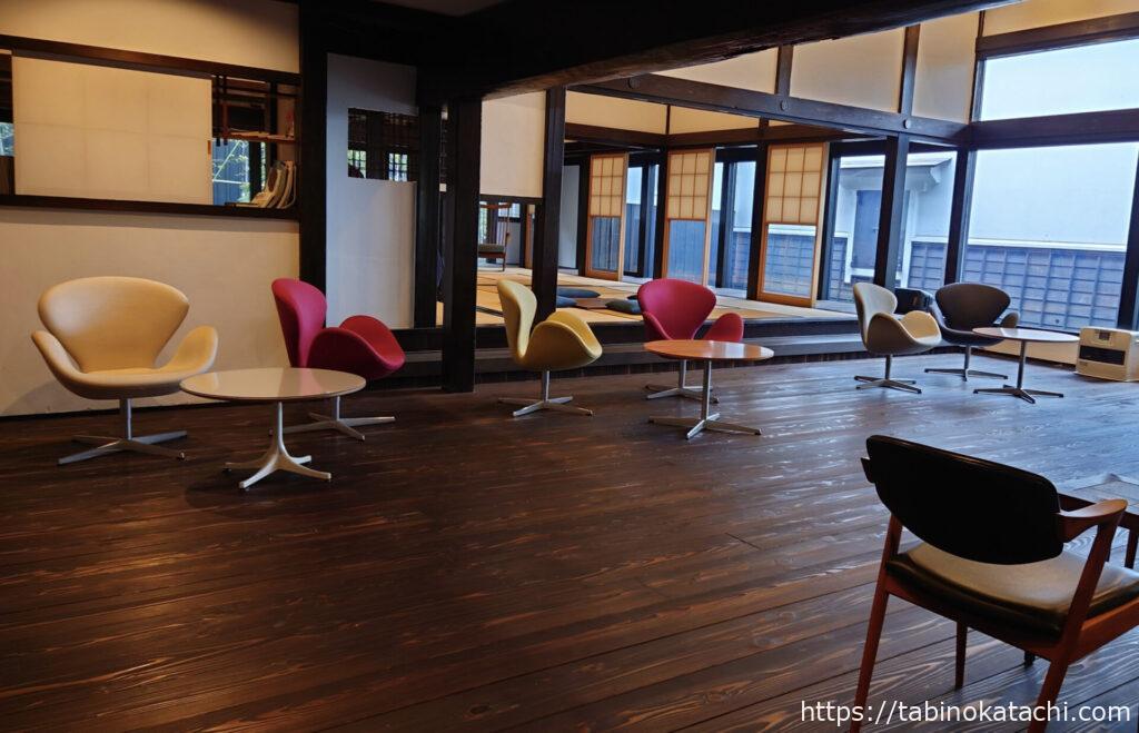 そとの和風なつくり一転、屋内はモダンな作りです。ラウンジには、アネル・ヤコブセンのスワンチェアが色とりどり並び、伝統と利便性が融合されている空間。北欧家具って、和の雰囲気と本当によくあいますよね。北欧好きとしてはたまらない風景。