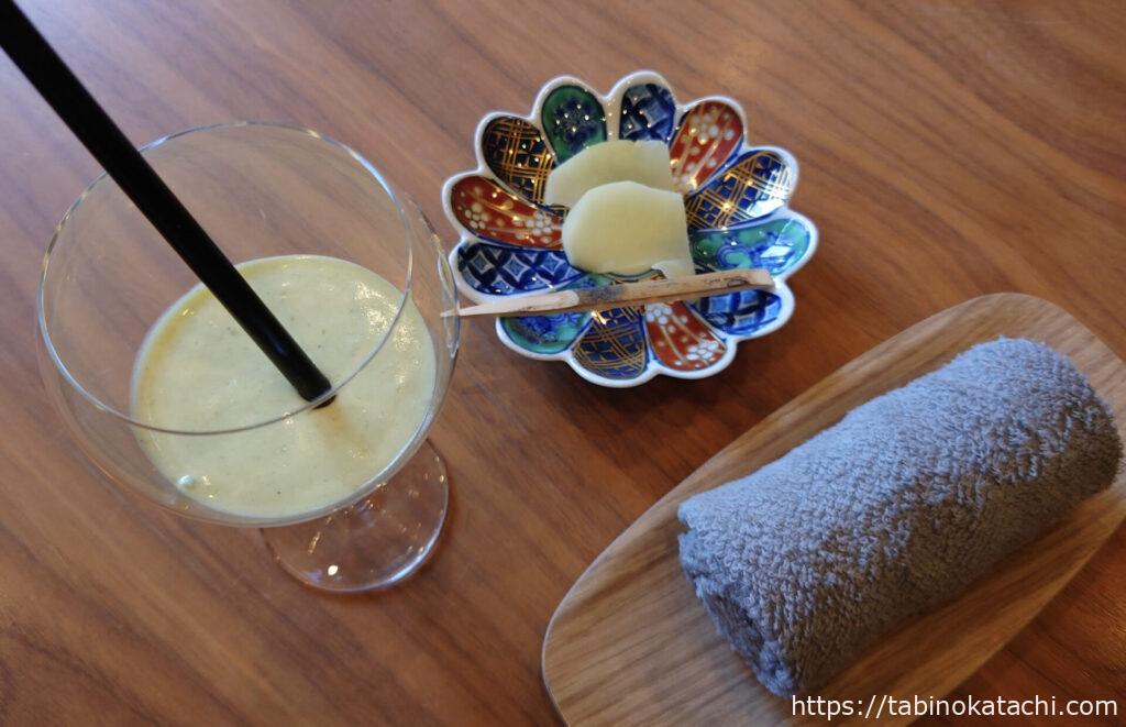 ウェルカムドリンクには、日本酒と、ずんだシェイクが選べるということで、1つづついただきました。日本酒は、裏・雅山流。山形県米沢市の蔵元、新藤酒造店さんのお酒です。思わず「裏?」と呟くと、スタッフさんに、「裏がついていない雅山流もあるんですよ」と、教えていただきました。一気に飲み干したあめお君。スタッフさんに、「おかわりいかがですか」と、声をかけていただき、2杯目をいただいてました・・・笑。