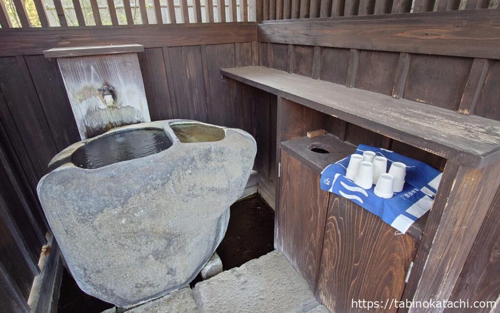 入り口の向かって左横には、温泉を試飲できるように、紙コップが置いてあります。実際に飲んでみると、少し塩味のする硫黄泉の香りがしました。