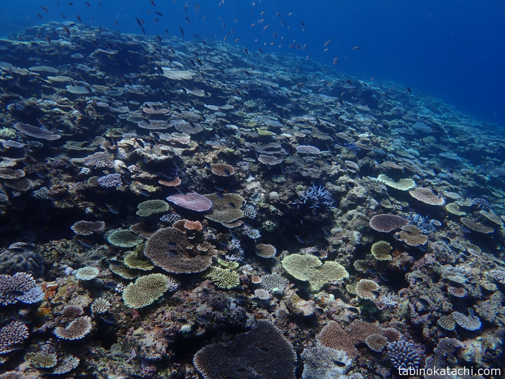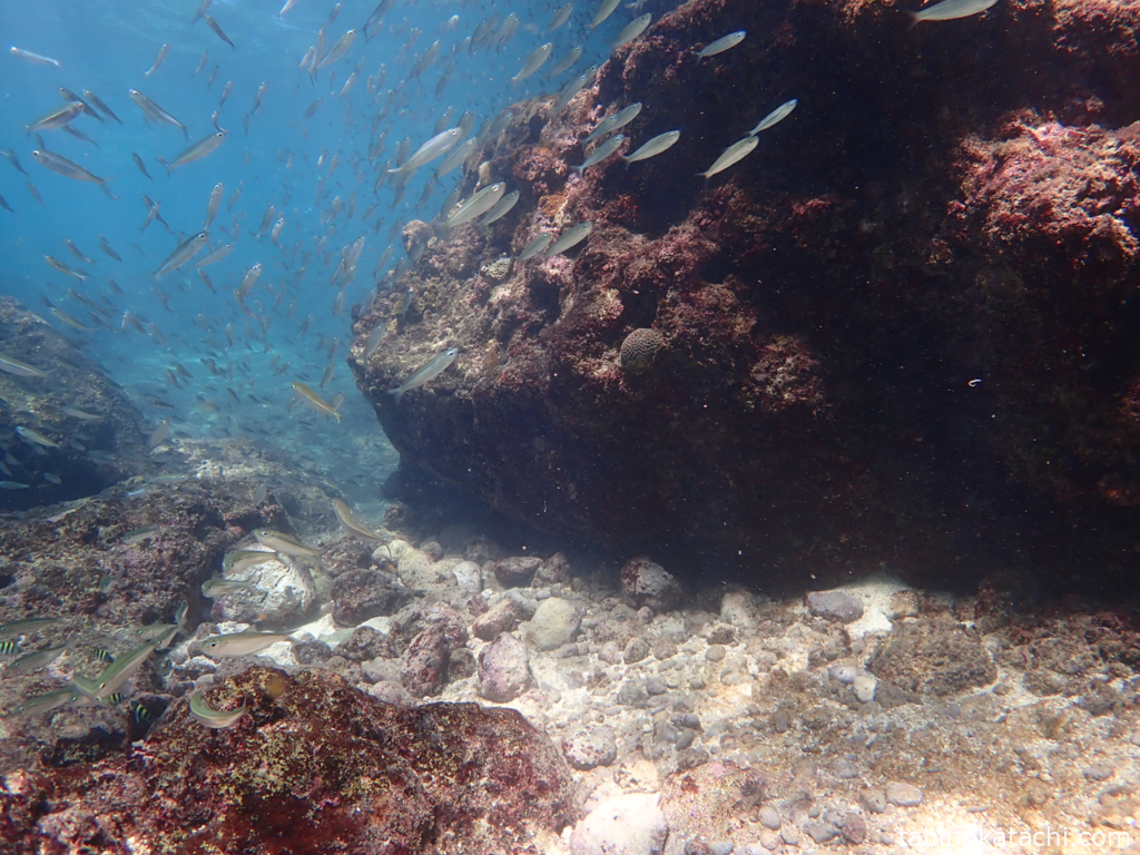 我々も、急な階段をくだってエントリー。海にはいって早々、ミジュンの群れに遭遇!キラキラして本当にきれいでした。少し進むと、珊瑚がぎっしり。ただ、浅瀬の珊瑚は、海水温上昇でかなり白化がすすんでいるようでした。少し深場の珊瑚は元気!