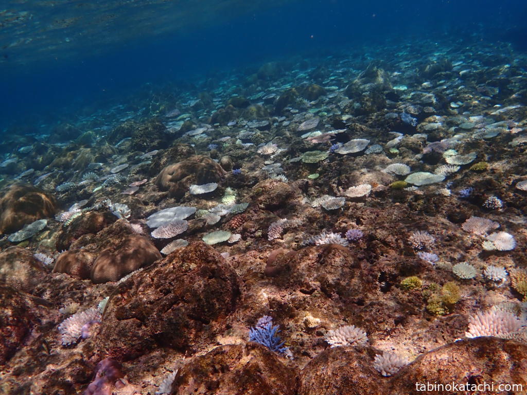 浅瀬の珊瑚は、白やピンクになり白化がすすんでいました