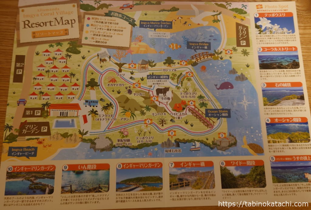 今回のシューノーケリング冬合宿では、アラマンダ インギャーコーラルビレッジに宿泊しました。宮古島の南海岸にあるシギラリゾートのホテルの1つです。インギャーマリンガーデンの横に位置していて、インギャーへのお散歩も楽しめます。ホテルでお散歩マップも作成されていて、チェックインのときにいただきました。撮影スポットなどもかかれていたりして、役立つマップでした!