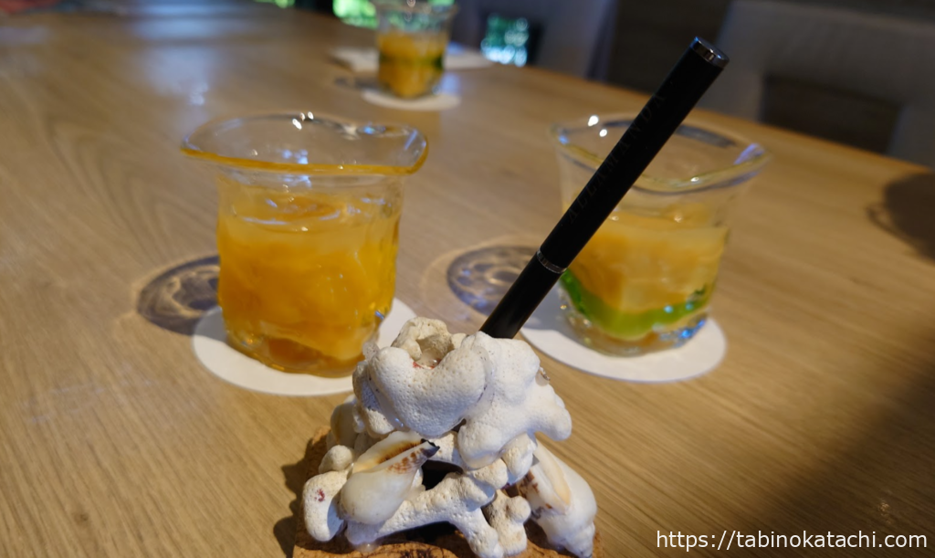チェックインは、ホテルのレストランで行います。ウェルカムドリンクをいただきながら、ホテル内の説明と、手続きを行います。琉球グラスがカワイイです。