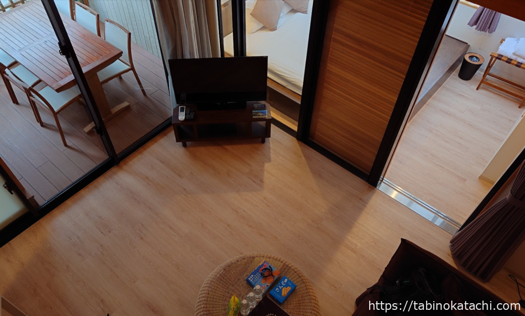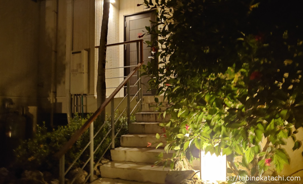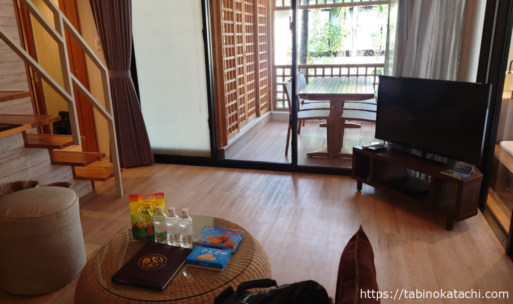 ヴィラは少し斜面になったところに立っているので、お部屋によっては、玄関まで階段があるケースがあります。今回は私たちは、階段で上がるタイプのお部屋でした。リクエストが通るかはわかりませんが、小さいお子さん連れやおじいちゃん、おばあちゃんとの旅行の際は、階段なしのお部屋を希望されるほうが便利だとおもいます。