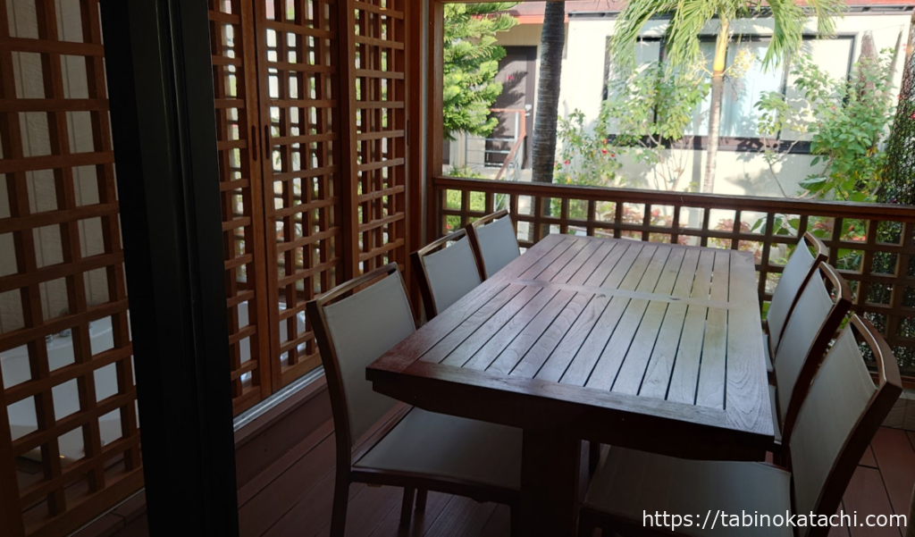 リビングルームからは、テラスやジャクジーに出られるようになっています。テラスにはテーブルや椅子も配置されていて、リゾート感満載なのですが、ただですね・・・。この横は他のヴィラにむかう通路になっているので、宿泊するゲストの通り道なんです。ジャグジーも同様に通路に面しているので、チェックインのときに、「ジャクジーは通路に面しているので、水着を着用するか、シェードをおろして入ってください」と注意がありました。このお部屋がというより、すべてのヴィラが通路に面しているので、同じ状況になっていると思われます。
