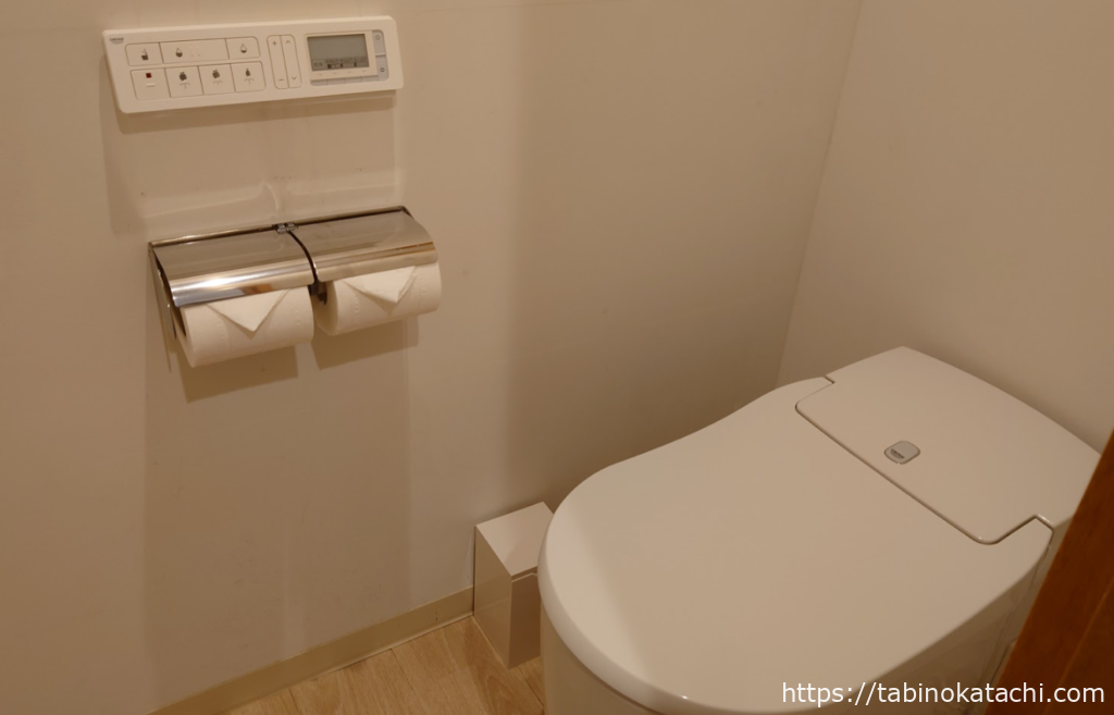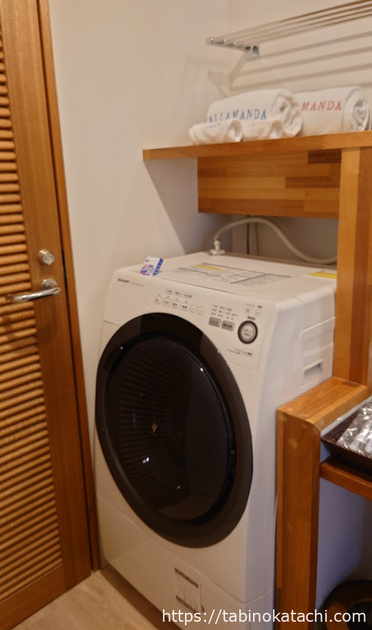 バスルームは、シャワールーム、洗面台、乾燥機付き洗濯機、お手洗いが並んでいる作りです。洗濯機付は便利ですね。夏でも冬でも、我が家のシュノーケリング旅行では、水着やウェットを洗うため洗濯機が必須なので、お部屋に洗濯機があるから、こちらに宿泊したといっても過言ではないです(笑)。