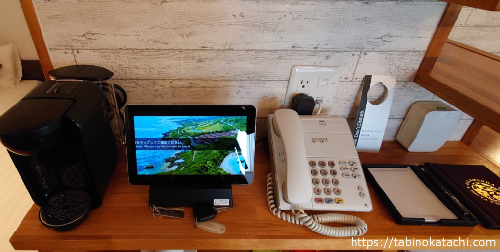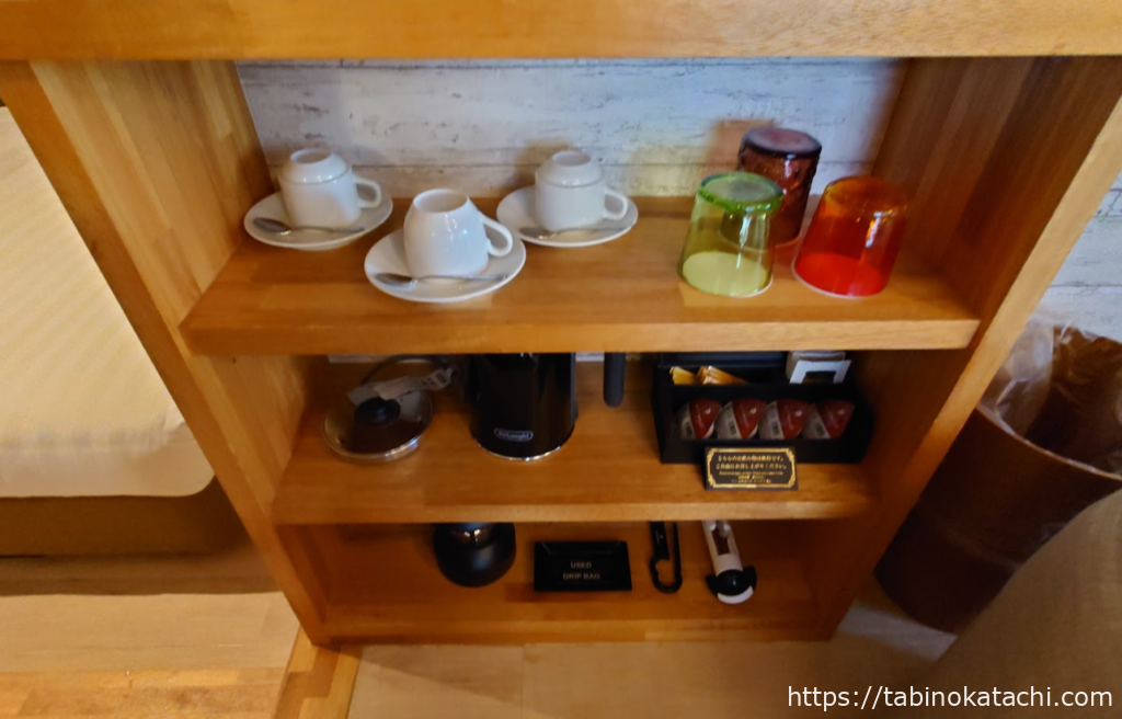 ミニバーとしては、コーヒー、紅茶などが用意されています。冷蔵庫は、入口横のシェルフの中にあります。一人暮らしで使う用の冷蔵庫サイズといったらわかりますかね?中身は空ですが、冷凍庫もあるので、夏場にアイスクリームやロックアイスなどを買ってきて、置いておくことも可能です。また、電子レンジもついていました。