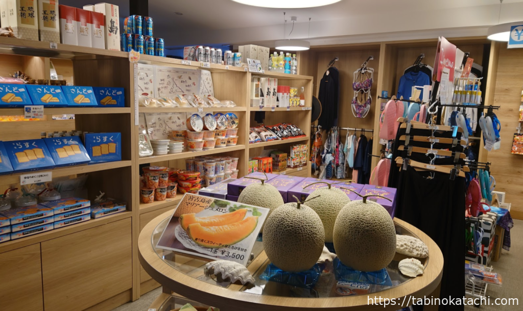 こちらが、レセプションの横にあるショップ。宮古島の特産品となりつつあるメロン!をはじめとして、お菓子、お酒、水着やカップ麺など、いろいろ取り揃えられていました。9:00~22:00と営業時間が長いので、ちょっと飲み物をとか、小腹が空いた・・・なんてときにも使えそうです。