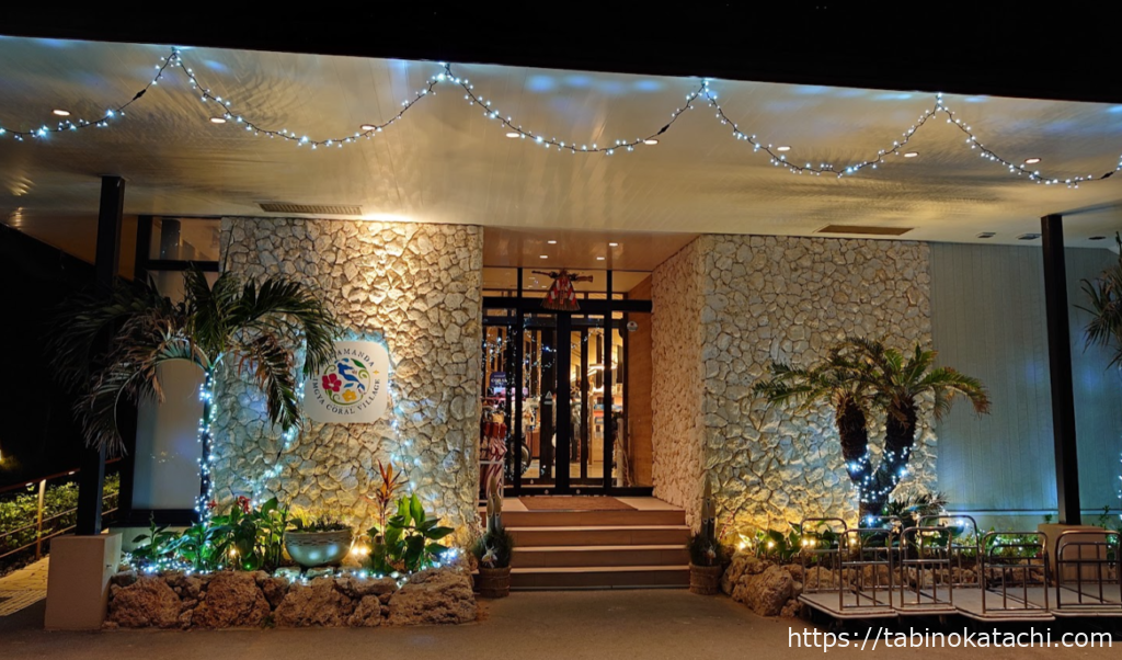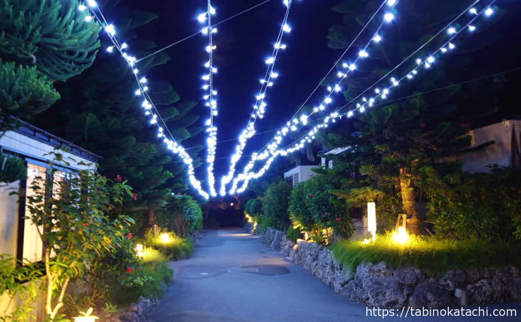 レセプション棟や各ヴィラまでの通路がライトアップされていました。冬だからかな?