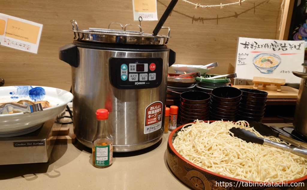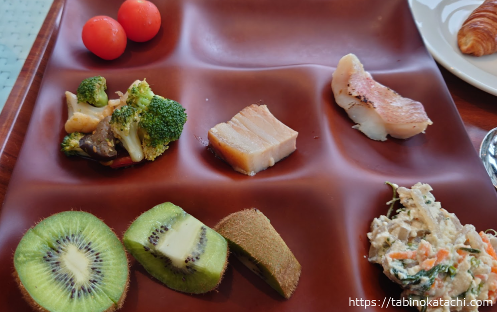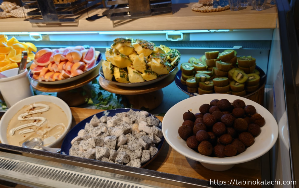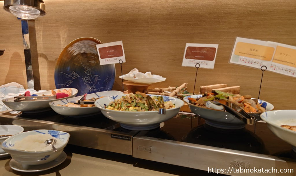 かなり幅広い品ぞろえで、日替わりの卵料理やウインナー、ハム、パンといった洋食、焼き魚や煮物、白和えなどの和食、日替わりのちゃんぷるーやラフテー、モズク酢などの沖縄料理などが並んでいます。カレーや宮古そばもありましたよ。そのほか、フルーツや、ヨーグルト、シリアル、日替わりのスイーツなど。