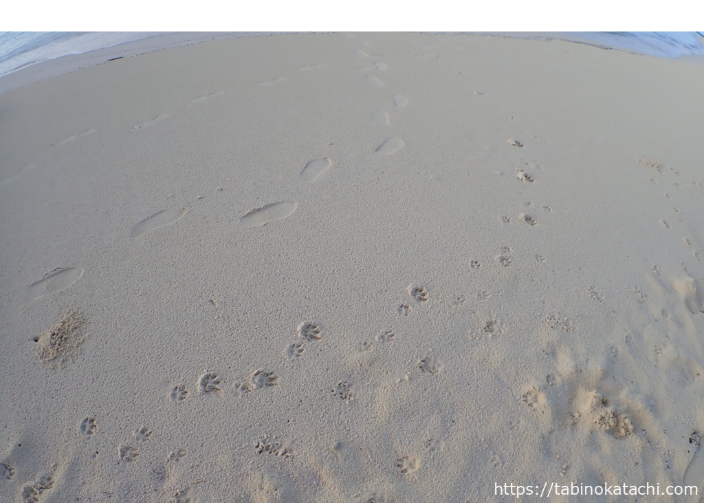 ワンコの足跡があります。こんなきれいなビーチをお散歩できるなんて、宮古のわんこは、恵まれてますね~。来間大橋もみえて、いい景色です。