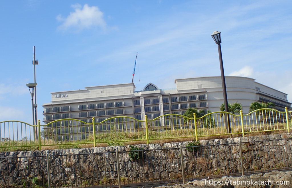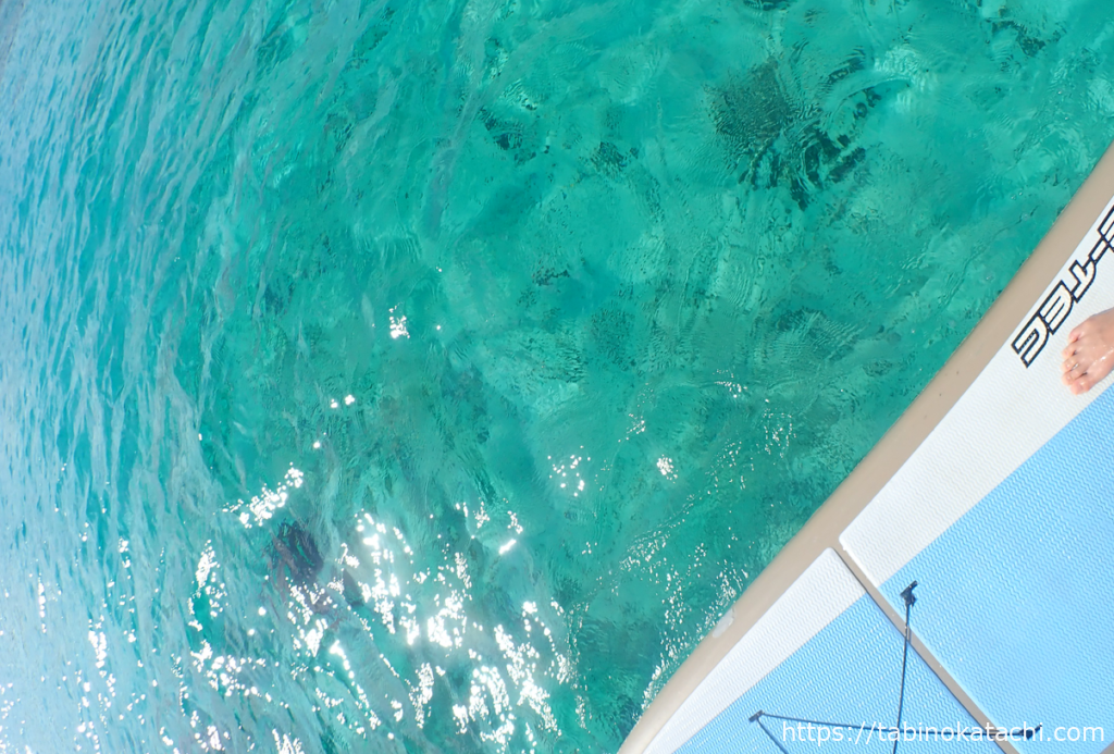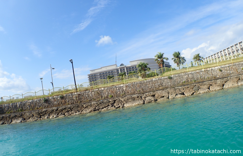 少し北風の強めの日だったので、穏やかな海でスタート。途中、建設中のヒルトンも見えました!海の色が、エメラルドグリーン。