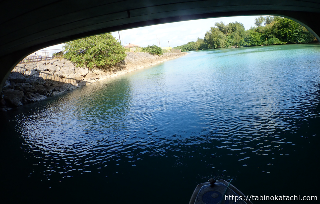 ちょこっと橋の下をくぐり、反対側からみたところ。このあと、もとの方角にもどって、近くのビーチにゴールです。ビーチに戻るとき、風が強かったので、結構苦労しましたが、途中からかなり太陽もでてきて、海の色がきれいに見えました。